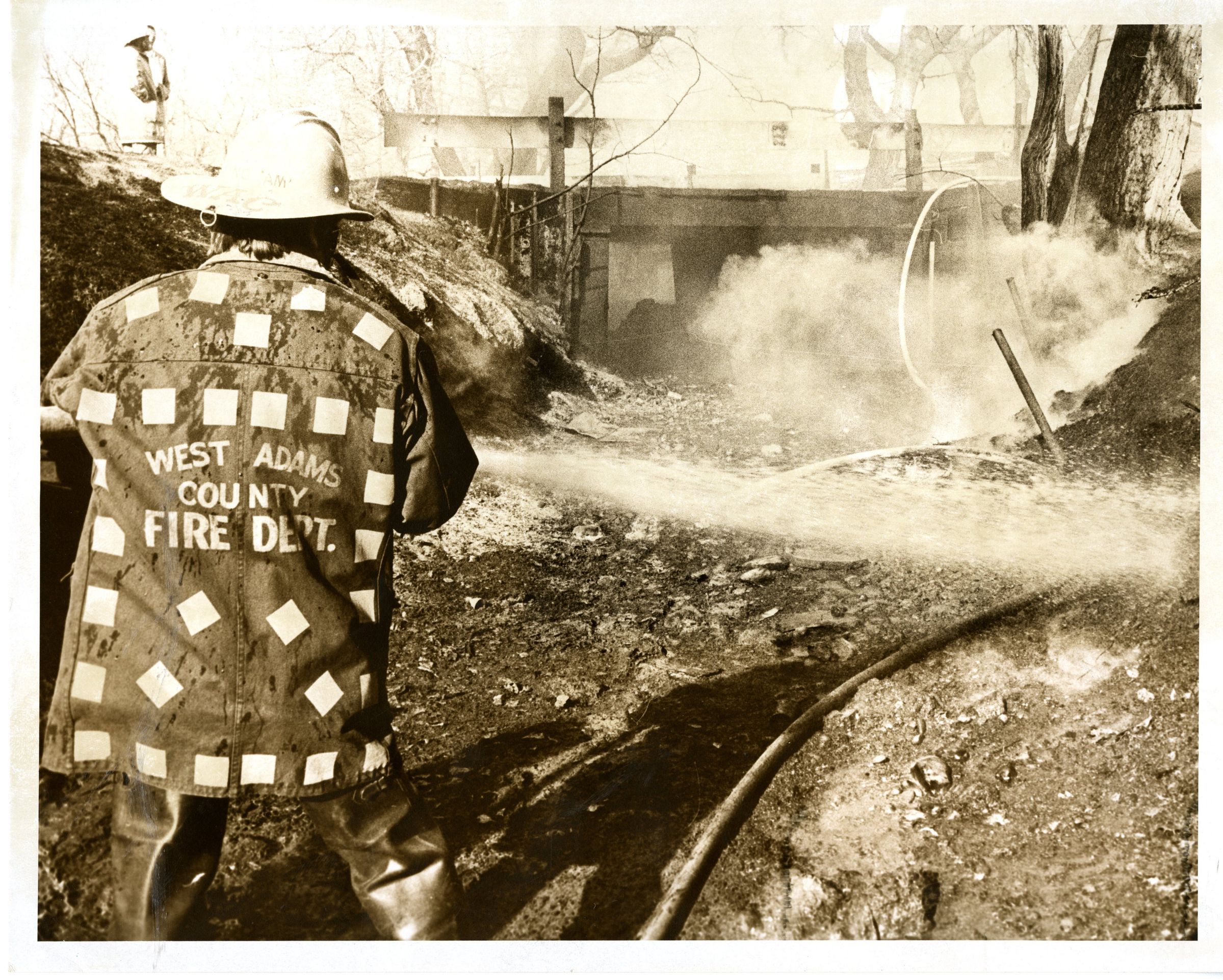 "Bridge Burned" West Adams Fire Dept. - man spraying hose at bridge