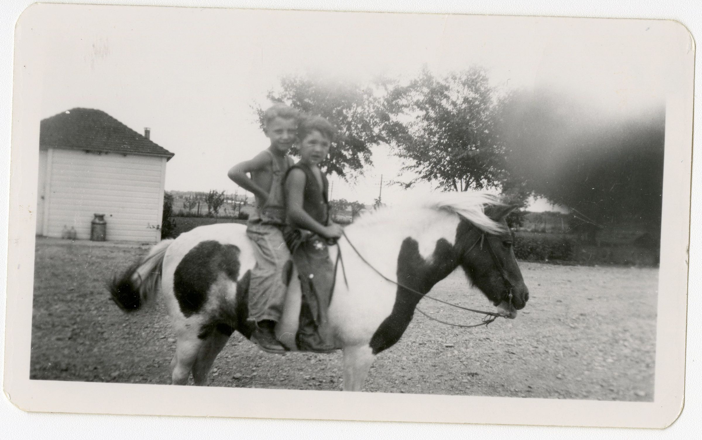 This is a black and white photo of possibly Dale and Gib Brunner on Sweetie the horse at the Brunner Farmhouse at old Wadsworth.