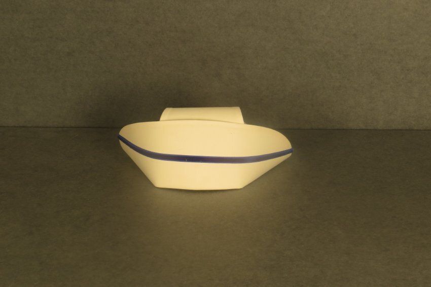White nurse's cap, stiffened and buttoned as if being worn. There is a blue velvet ribbon that runs across the front of the hat. One white button secures the hat in back. The tag on the inside reads "Kay's Caps / Green Island N.Y." Handwritten inside the hat is the name "Camie Peters". The hat measures 3" (h) x 8" (w) x 5" (l).
