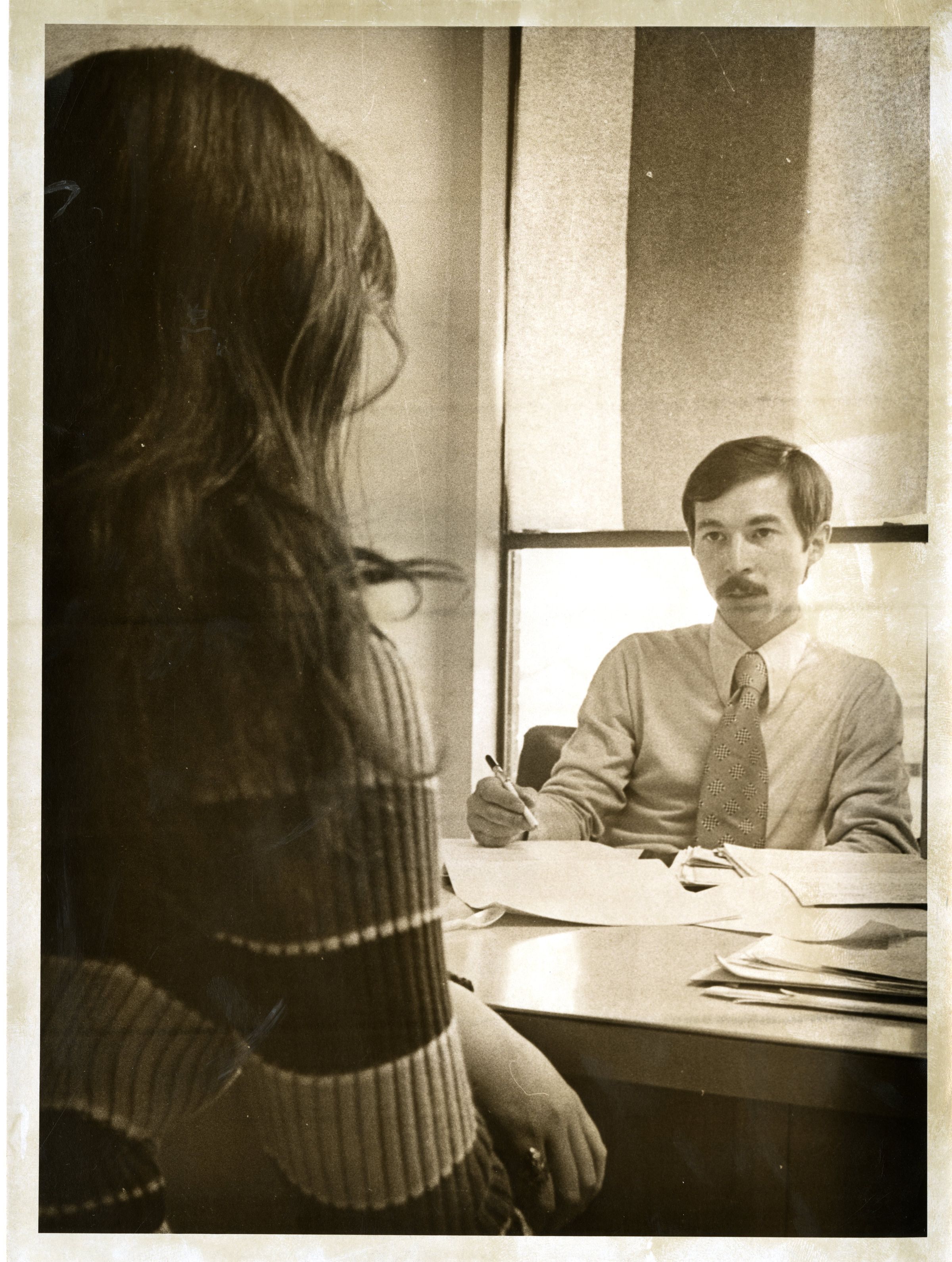 Dan Schuler speech and A new approach - man at desk talking with young woman