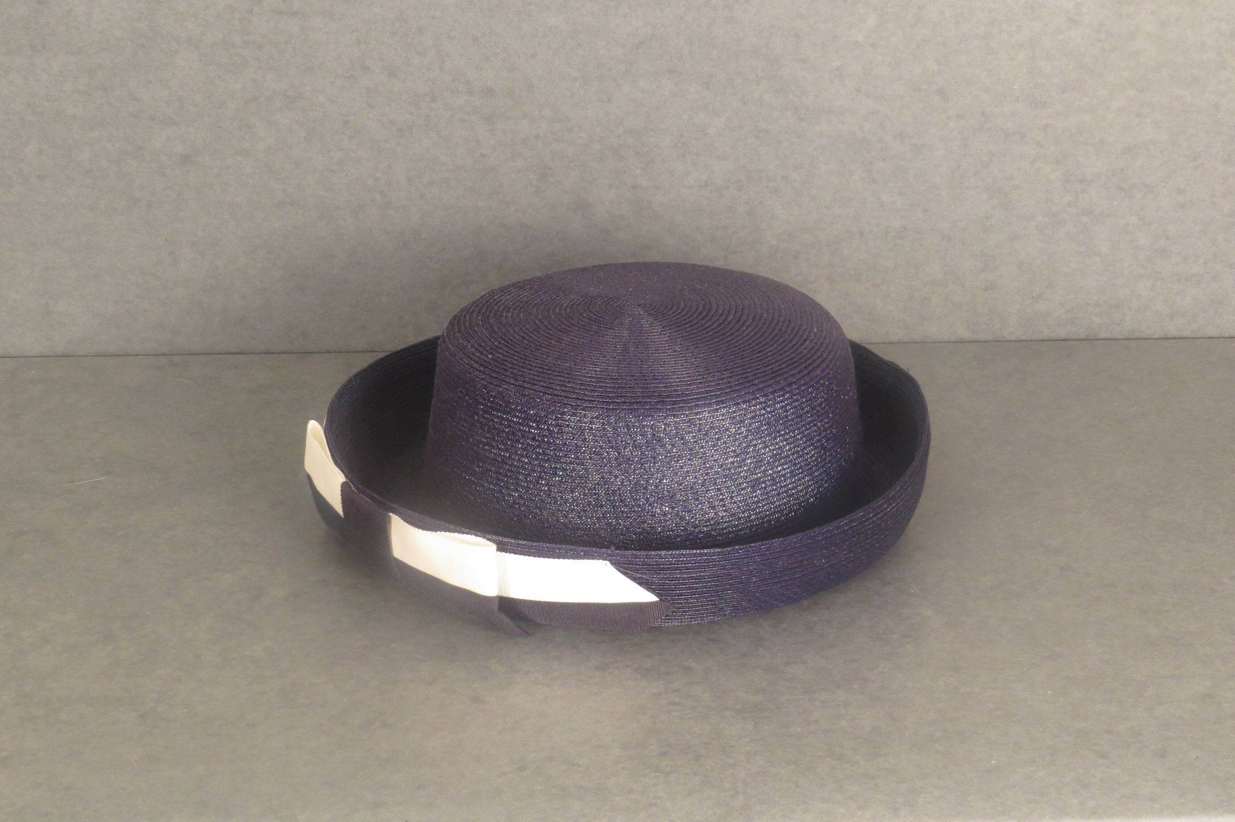 Navy straw hat with large turned-up brim. There is a wide white and navy half-striped grosgrian bow on front. The brim is turned up about half the height of the crown. The hat measures 3.5" (h) x 10" (diam). Hat may be 2002.10.1 (ITovar)