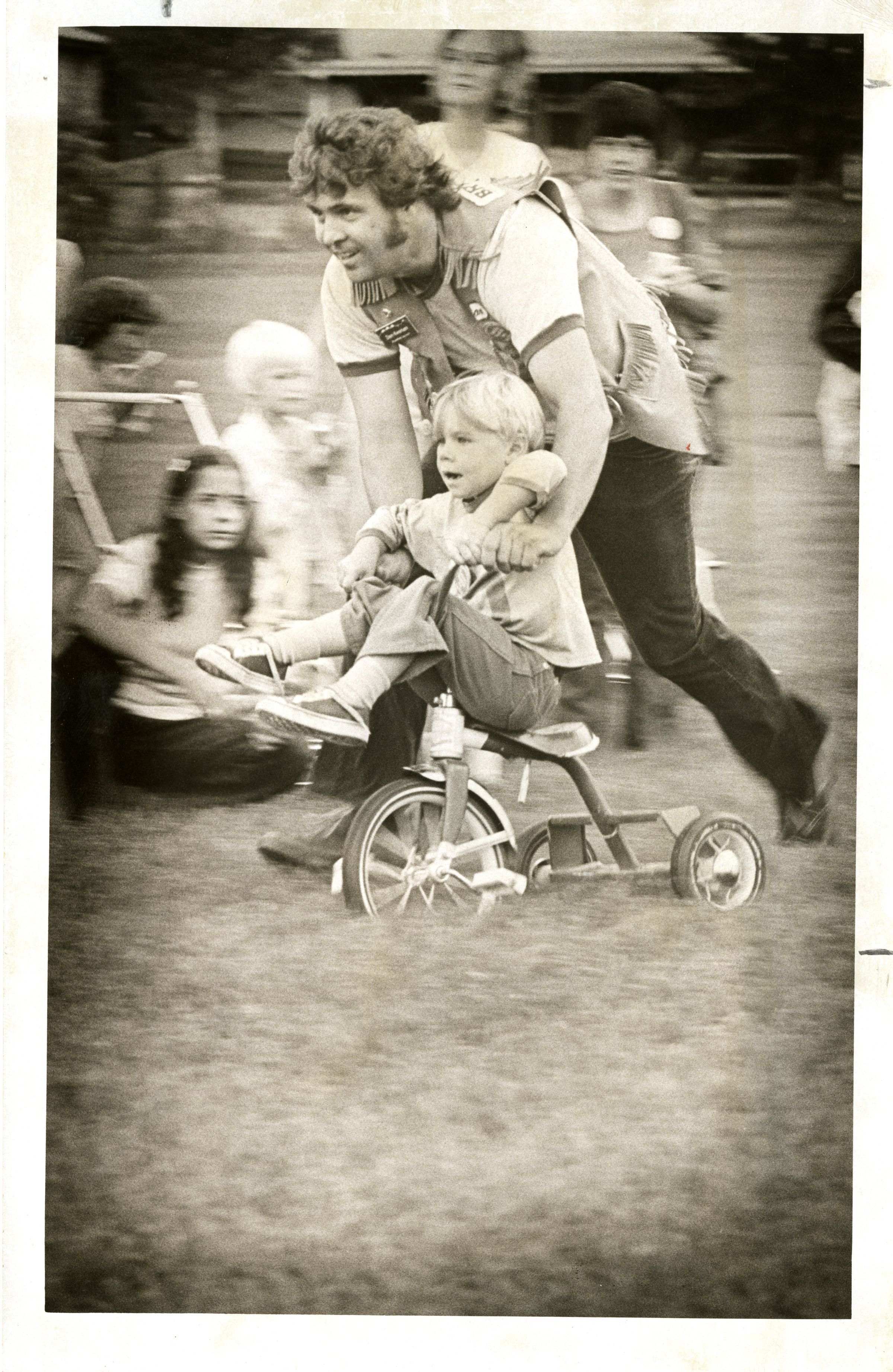 Man pushing boy on tricycle - spectators: Broomfield Days?