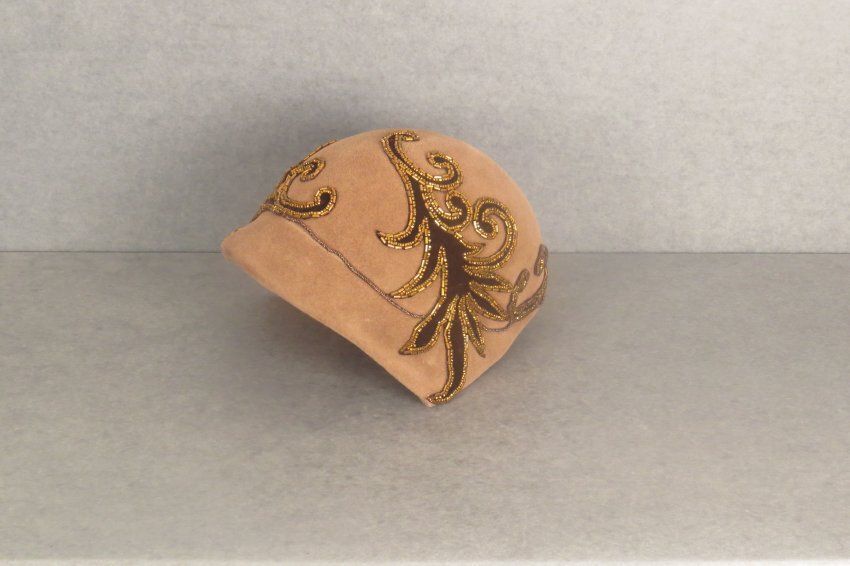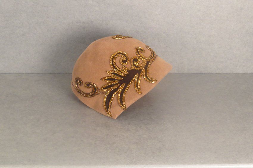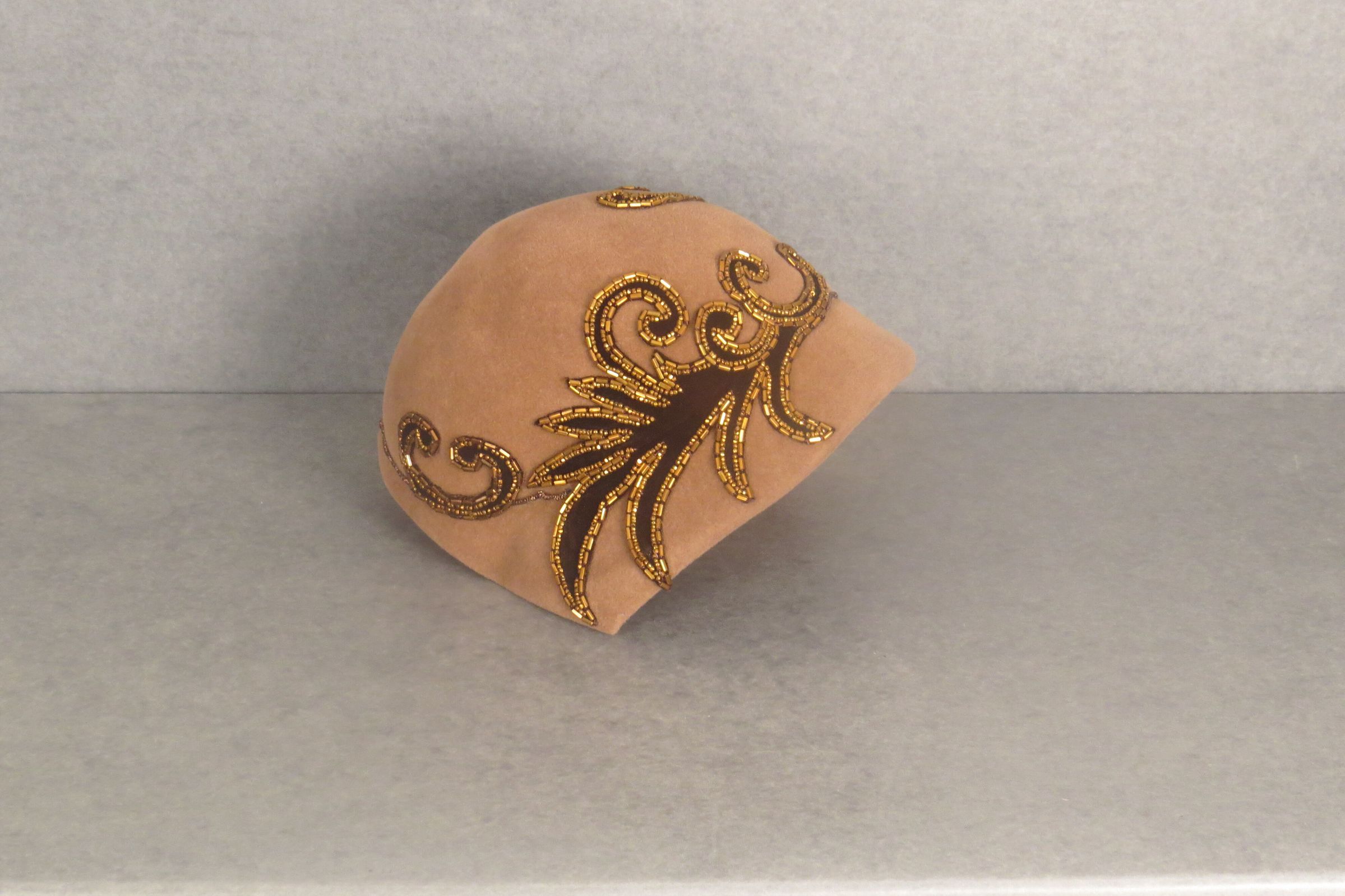 Brown felt cloche with longer sections over the ears. Darker brown velvet is appliqued around the top of the crown in leafy type patterns and embroidered with gold beading around outside edges. The tag on the inside reads "Norman Durand Original". The hat measures 6" (h) x 10" (w) x 9" (l).