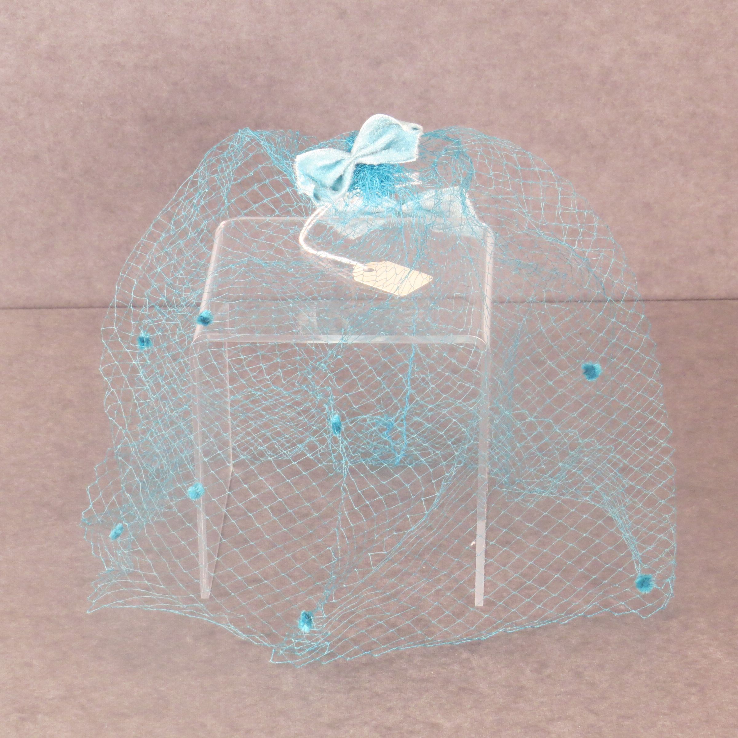 Turquoise blue netting with small velvet bow on top and back. Small chenille dots matching net and bows are around the middle. Circular in shape, would have fit over entire hair. Almost resembles a hair net. The headpiece measures 9" (h) x 11" (w).