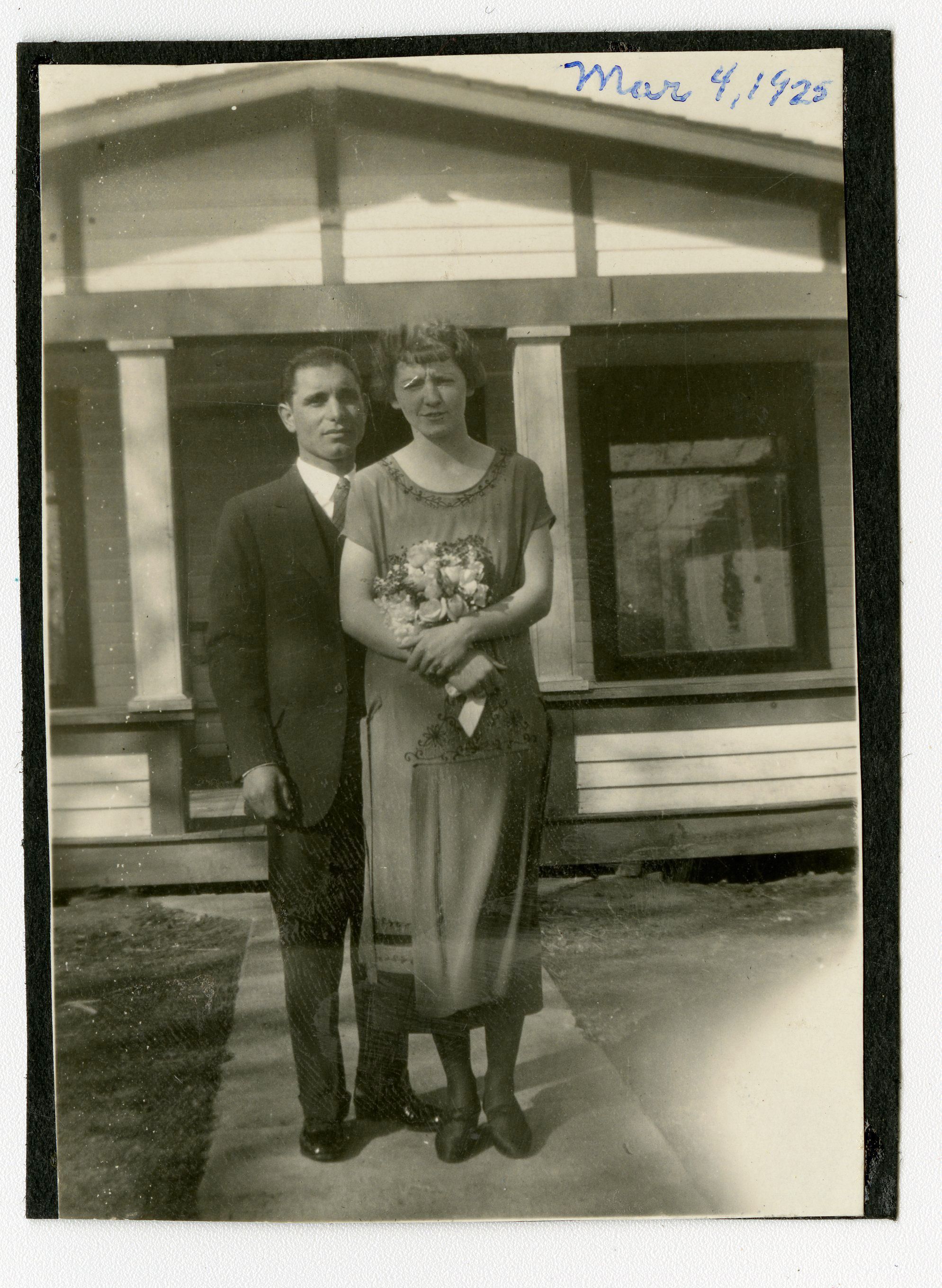Black and White photograph of a man and a woman. Photograph was taken outside of a house. A window and a covered porch can be seen in the background. The man is wearing a dark suit and is standing behind the woman who is wearing a dress and holding a bouquet of flowers. Identified as Lester C Brunner and Lib Brunner. Handwritten on the image is "Mar 4, 1925."
