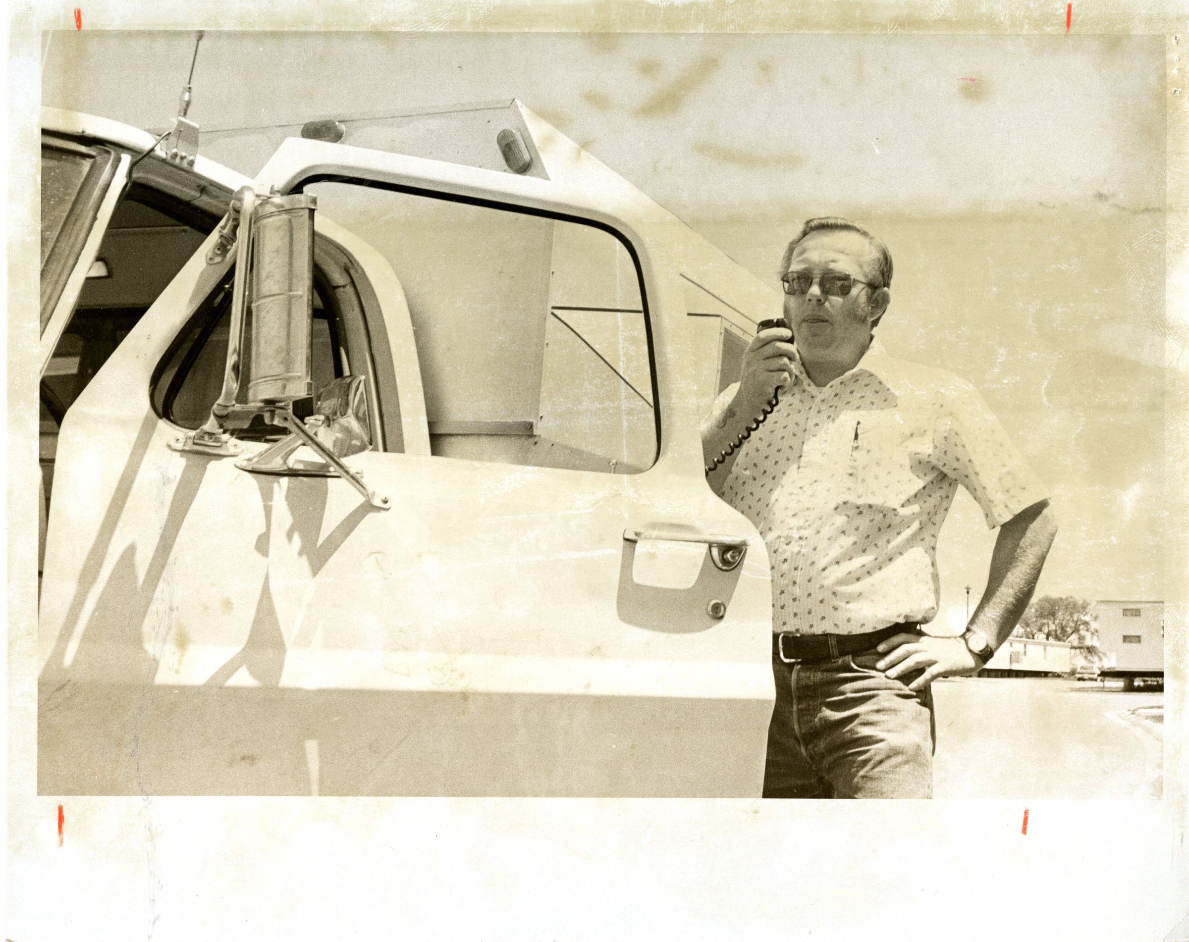 Gentleman (likely a volunteer fireman) on Patrol standing outside his truck communicating with someone on his CB radio. 07/16/1975.