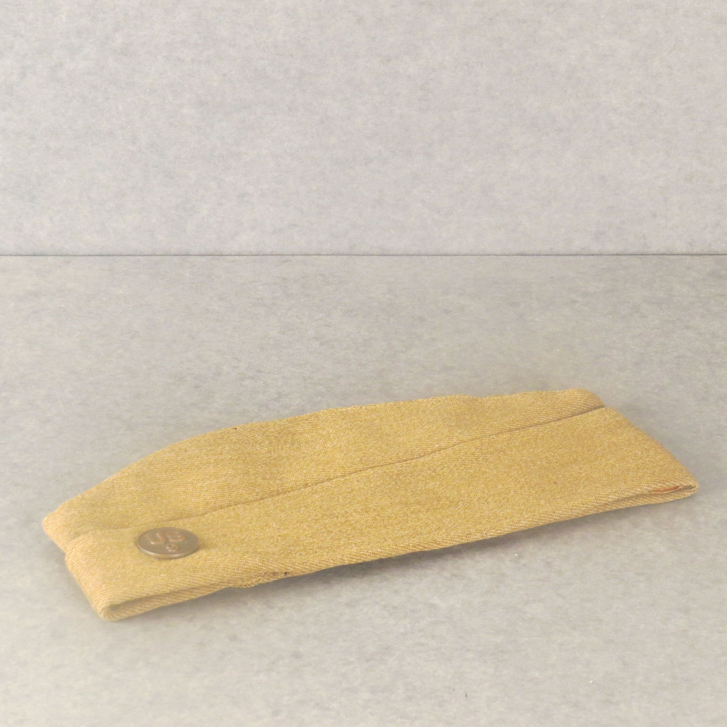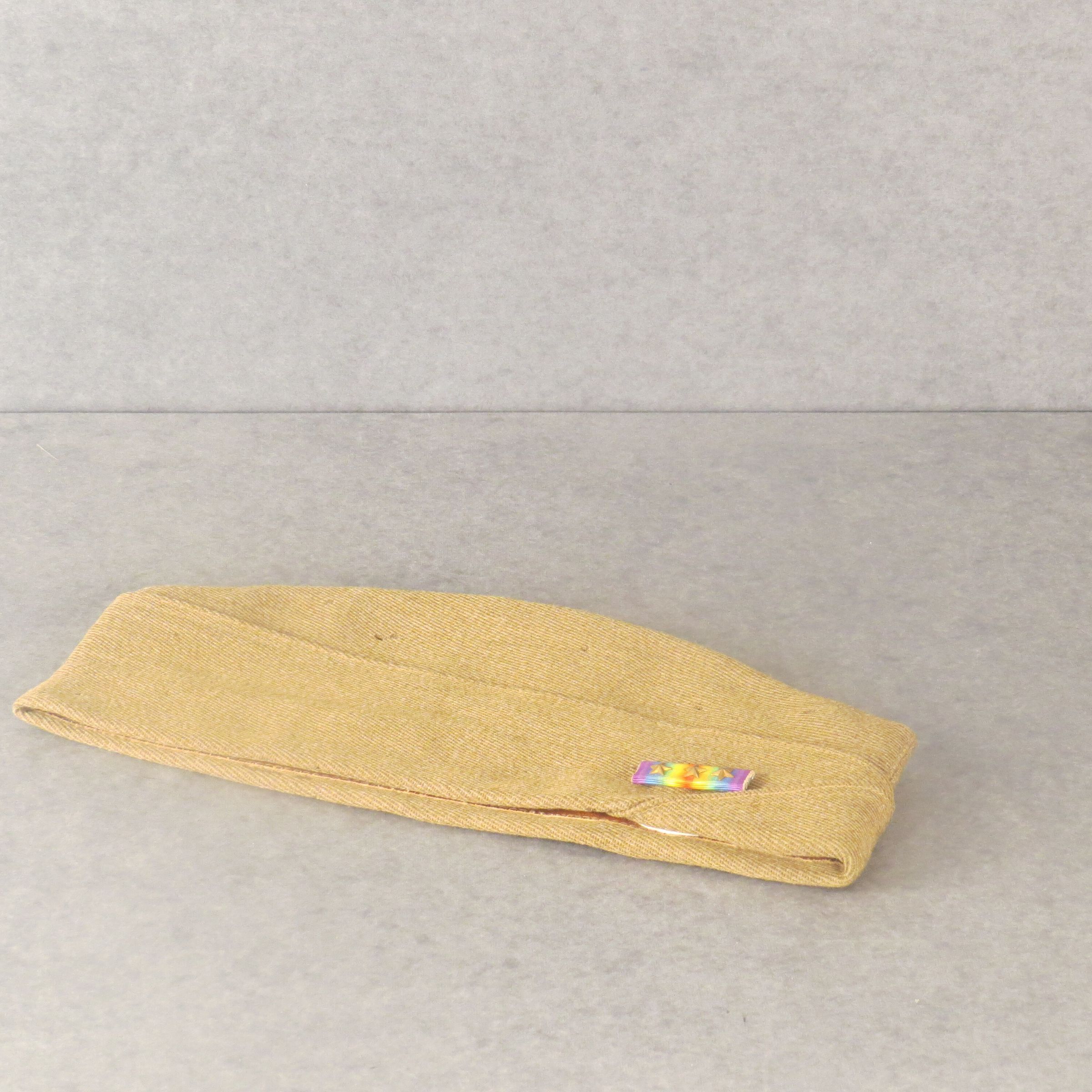 Olive green wool Garrison Cap from World War I (a). There is a leather band around the inside of the cap and a darker tan lining. There is also a rainbow ribbon (b) for World War I Victory Medal on one side of the hat, this ribbon has three stars across it. On the other side of the front is a circular pin (c) that is engraved with "U.S. 9". The hat measures 4.5" (h) x 11" (l).