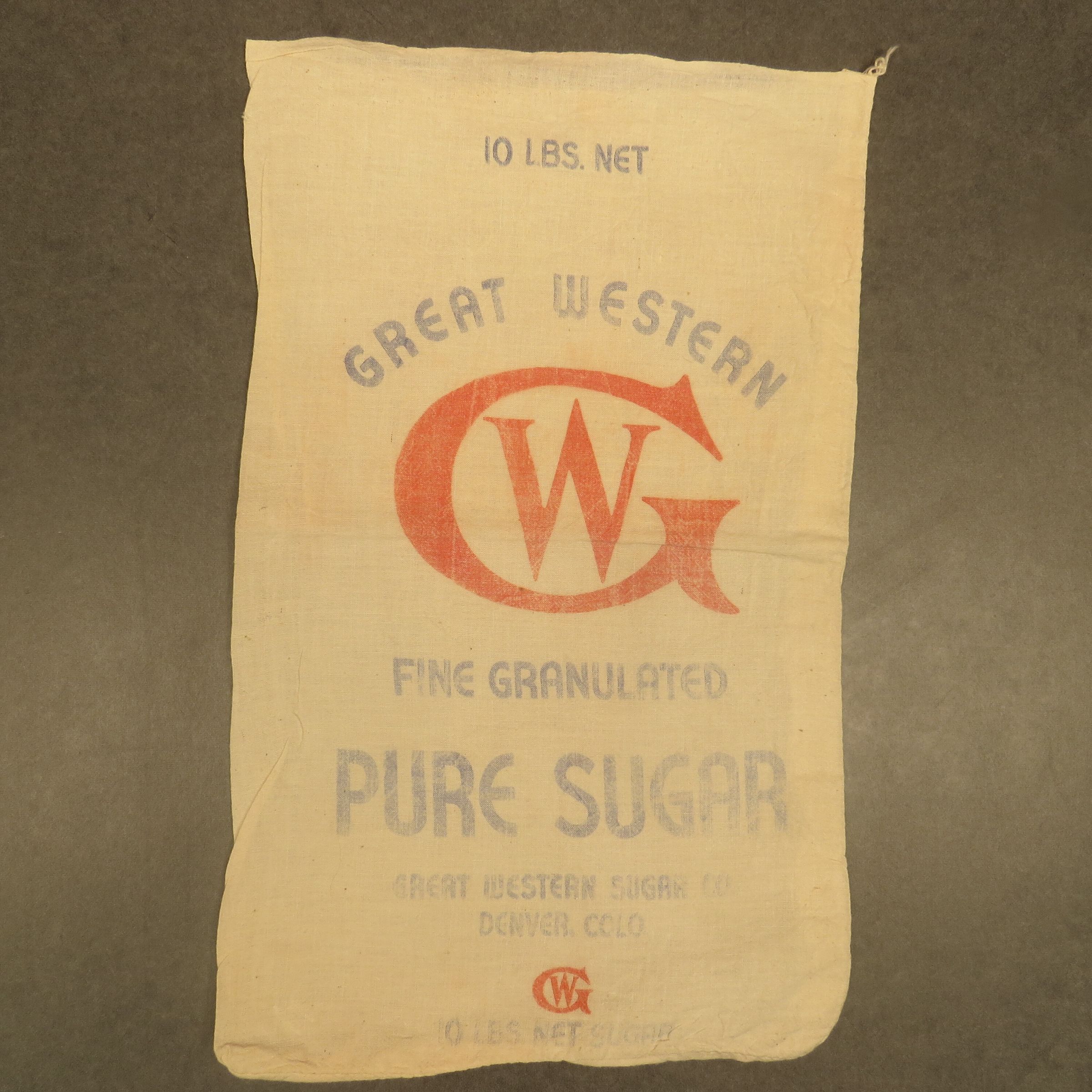 Off-white muslin sugar sack. Words are fading at the bottom. Text on sack reads, "Great Western / CW / Fine Granulated / Pure Sugar". The sack measures 8.75" (w) x 14.5" (l).