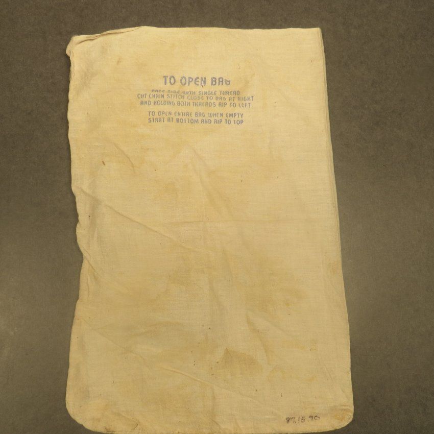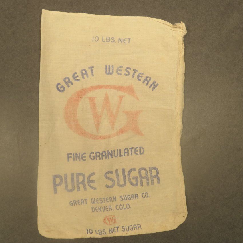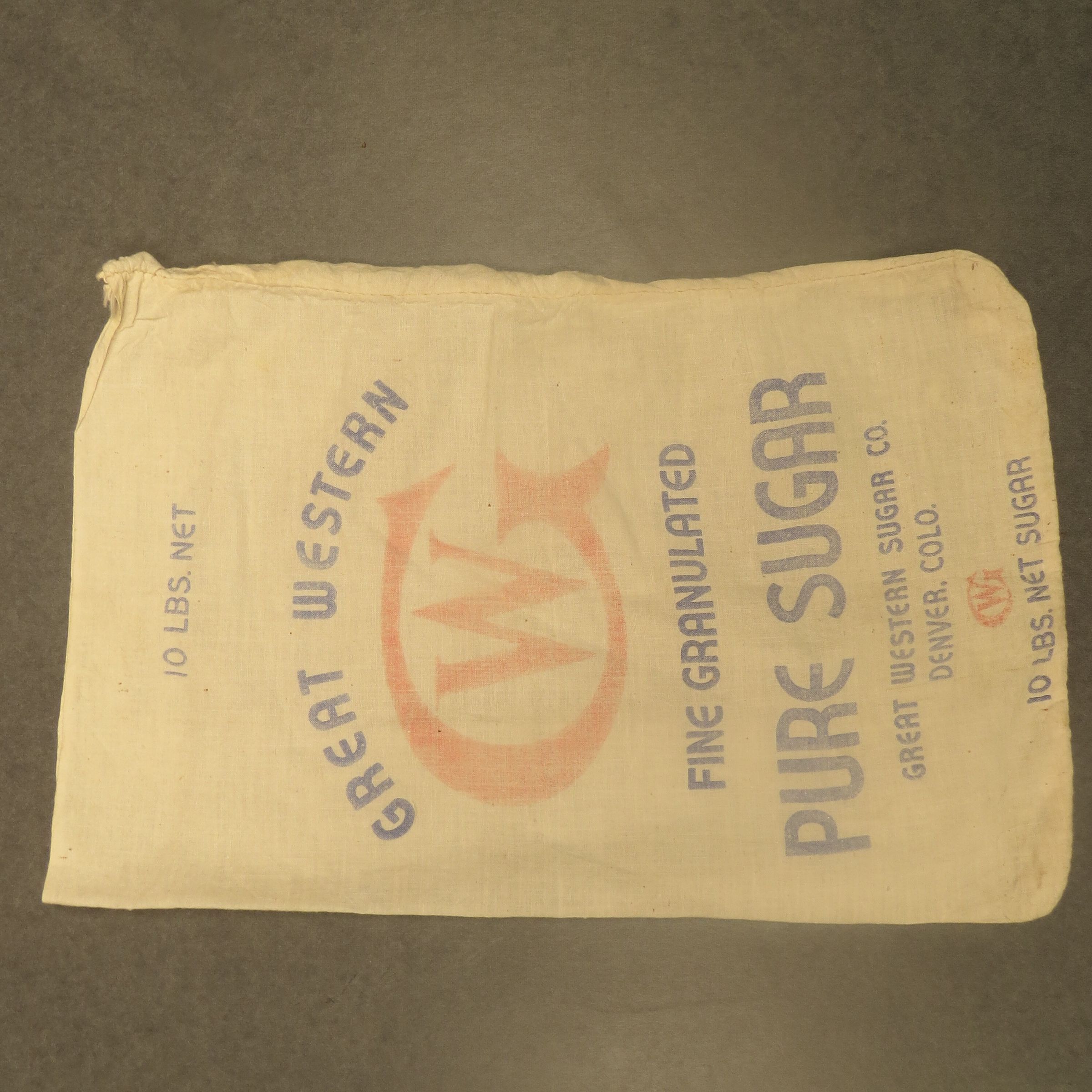 This is a cotton sugar bag with blue and red text on front that reads, "10 lbs. Net / Great Western / CW / Fine Granulated / Pure Sugar / Great Western Sugar Co. / Denver, COLO." The bag measures 9" (w) x 14.25" (l).Collection