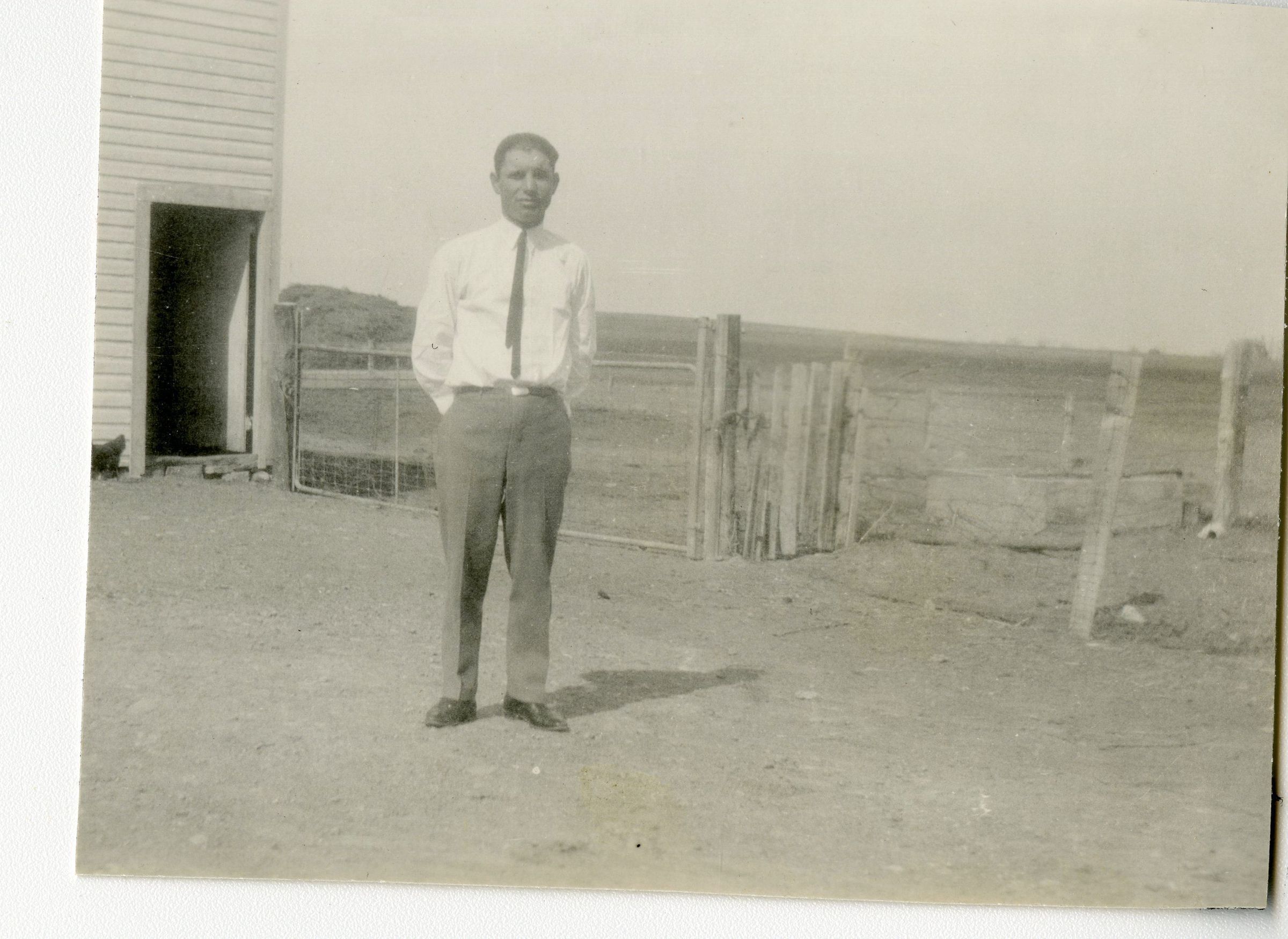 This is a black and white photo of Lester C. in button down shirt with a tie and slacks at the Farmhouse by fencing.