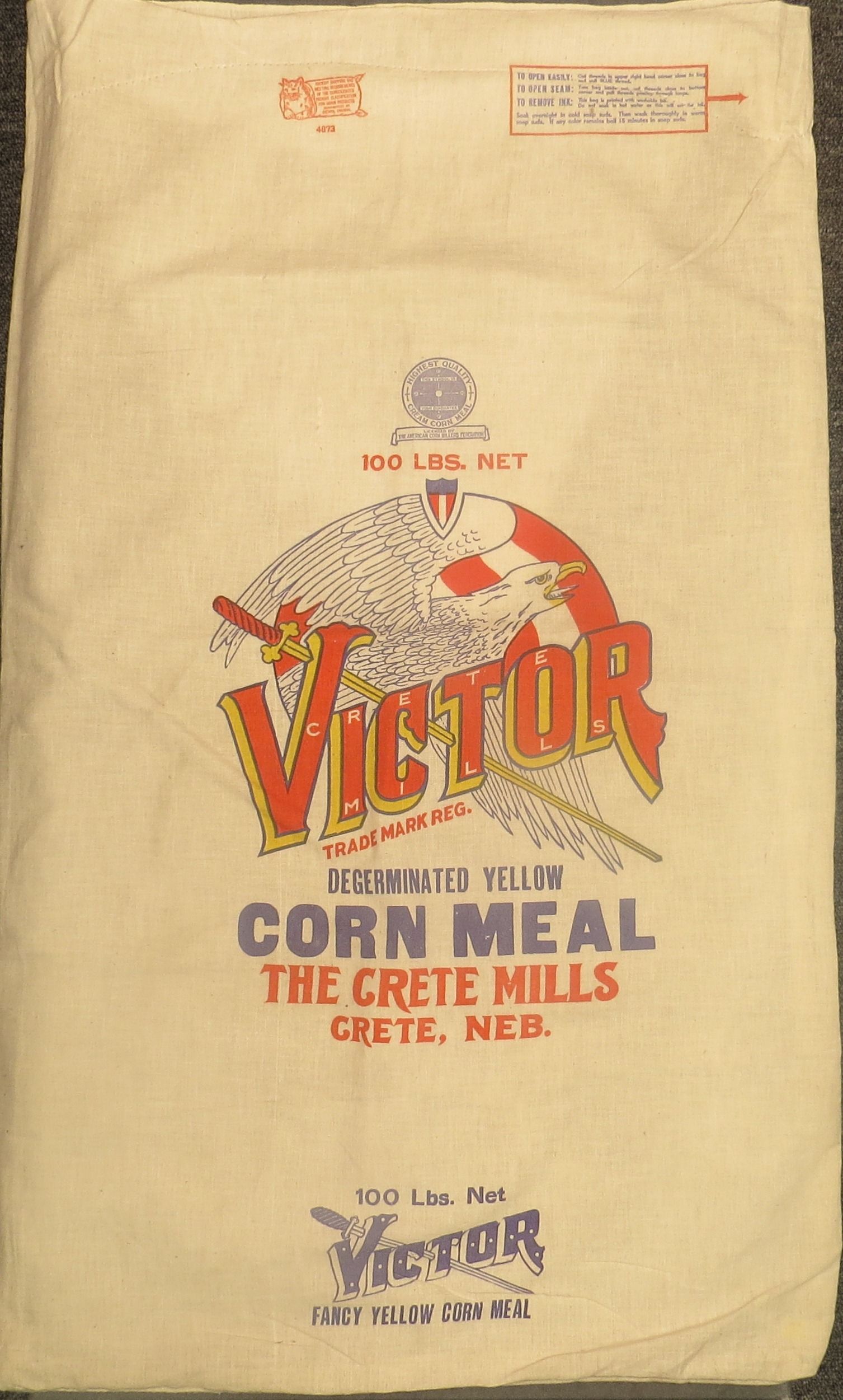 This is a large 100 lbs. net weight cotton bag. On the front there is an image of an eagle with the word "Victor" and a sword through it. The text on the front of the bag reads, "Victor Crete Mills Trademark Reg. / Degerminated Yellow / Corn Meal / The Crete Mills / Crete, Neb.". There are instructions at the top on how to dissolve the printing so that the textile could be used for other projects. The corn meal sack measures 22" (w) x 37" (l).Collection