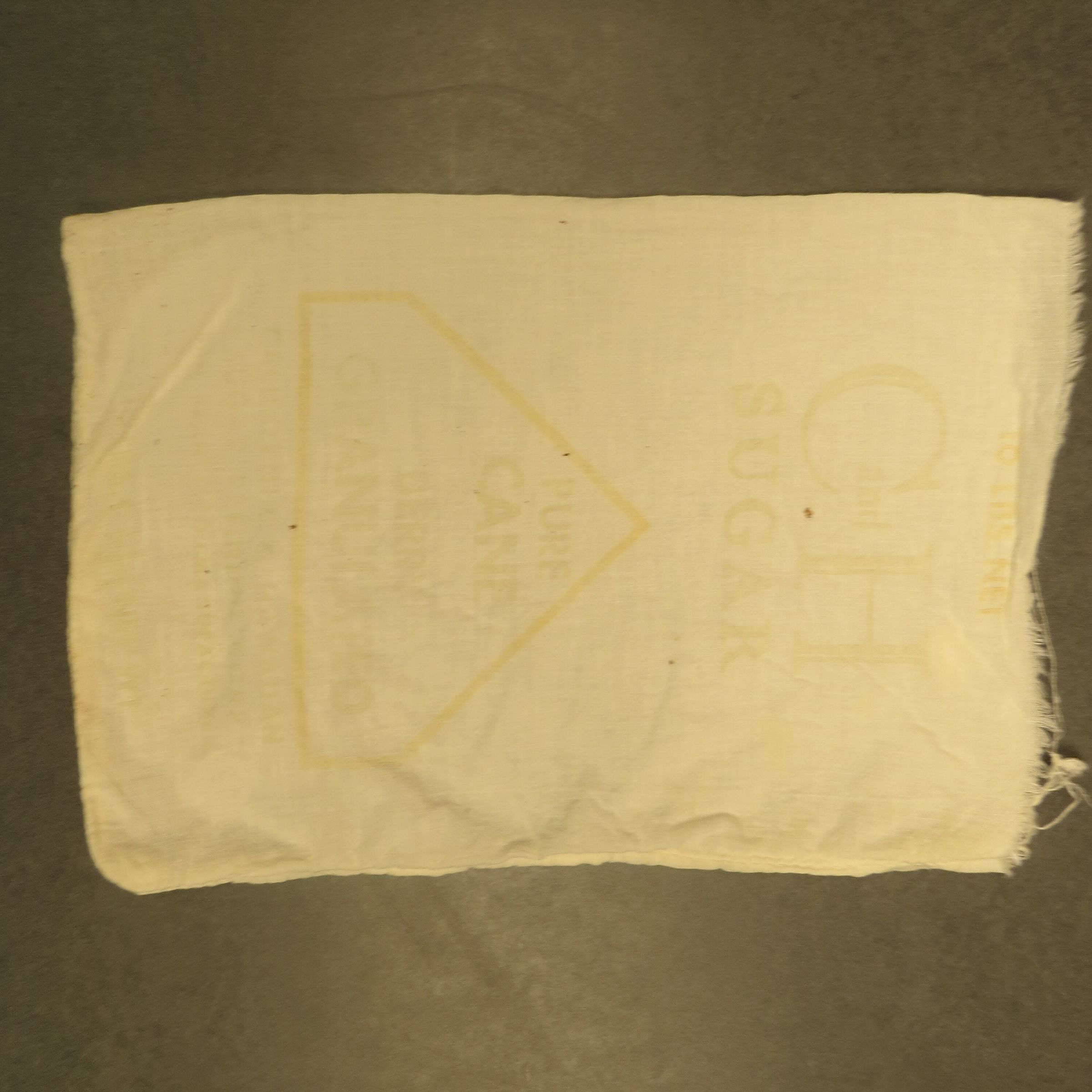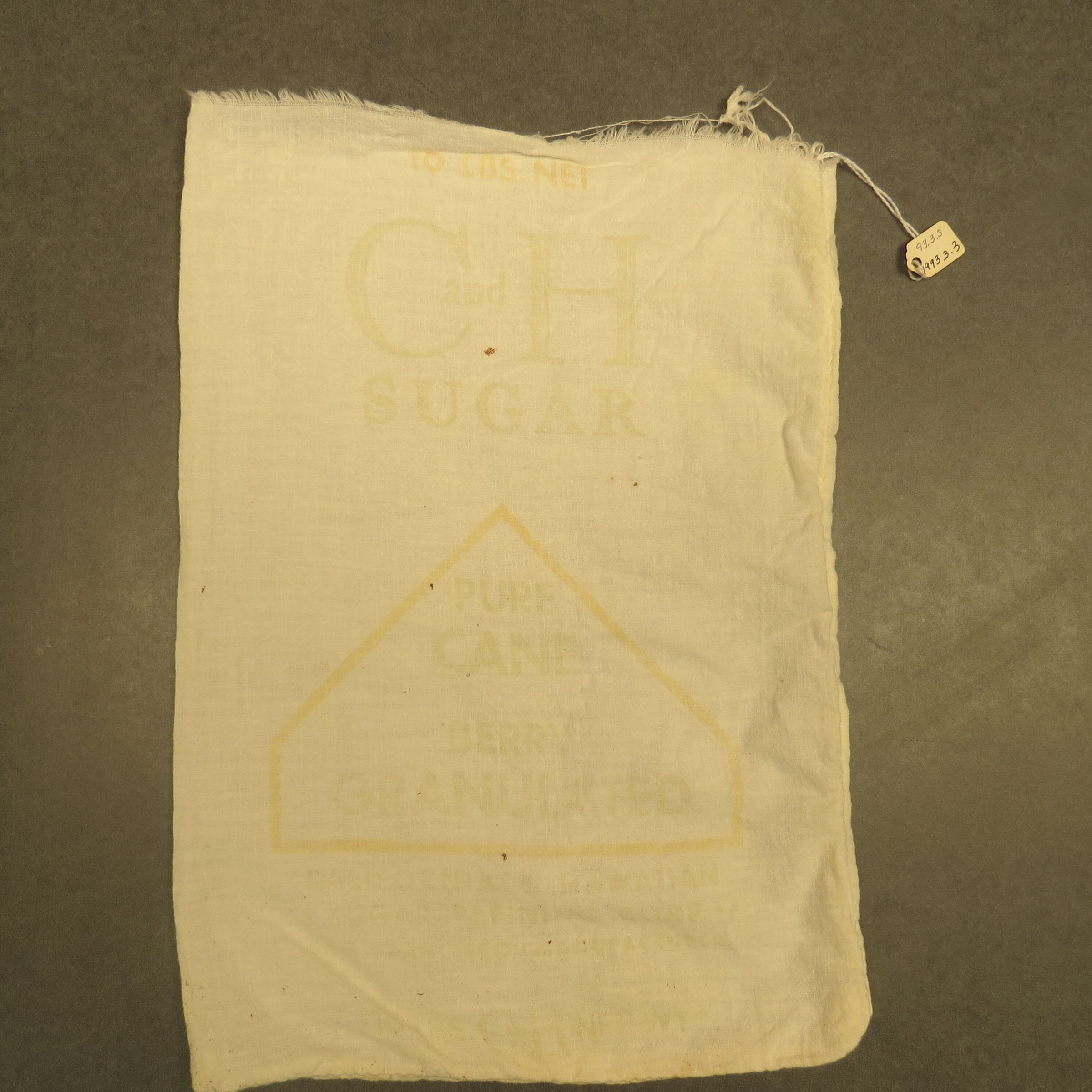 This is an off-white muslin material cloth bag that was used to cook coffee. The design and printing on front is badly faded. The top edge of the bag is frayed. The text on the front of the bag reads, "CH Sugar / Pure Cane / Berry Granulated". The bag measures 9" (w) x 13" (l).