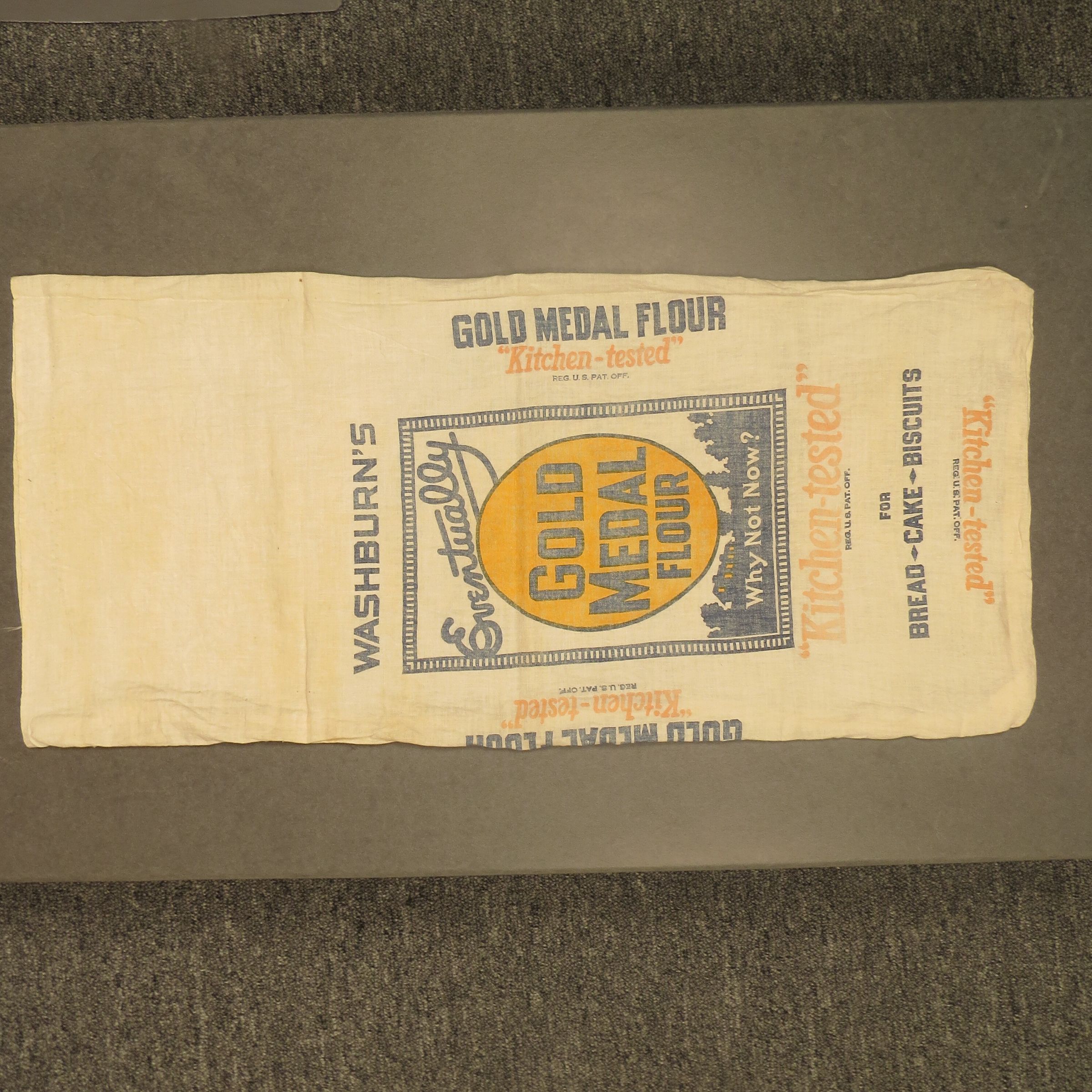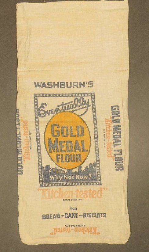 Off white muslin sack with designs on both sides. Text reads, "Washburn Crosby Flour/ Washburn's TradeMark Gold Medal / Bleached 24 lbs / Gold Medal Flour / 'Kitchen-tested' / Reg. U.S.. Pat. Off. / Manufactured By / General Mills, Inc. / General Offices - Minneapolis, Minnesota". The sack measures 11.5" (w) x 24.5" (l).Collection