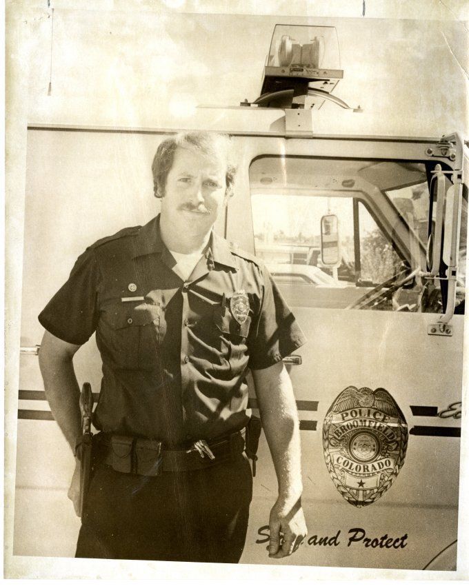 Greg Everett- a police officer- standing next to the Broomfield Police rescue truck. 08/18/1976.