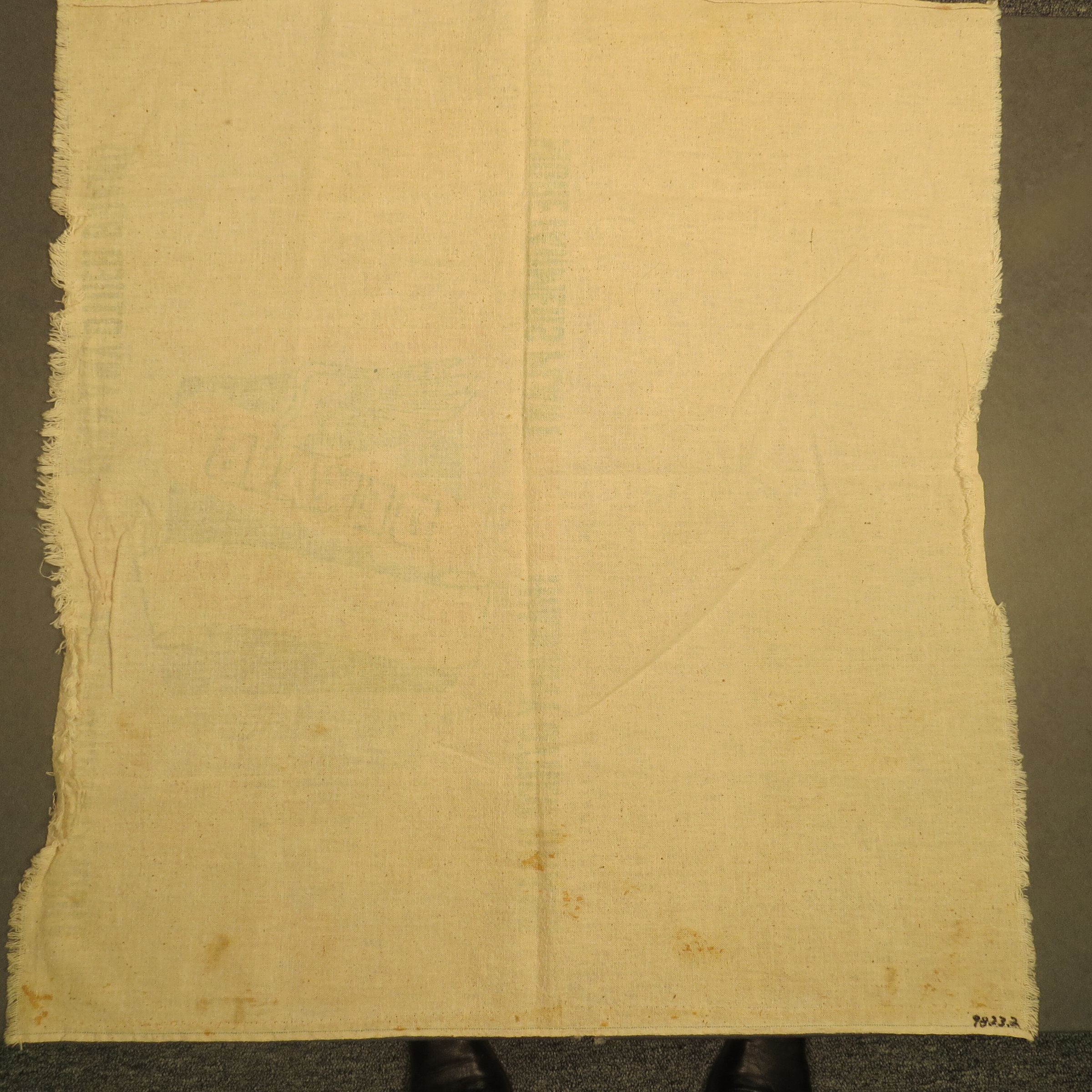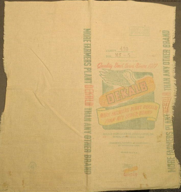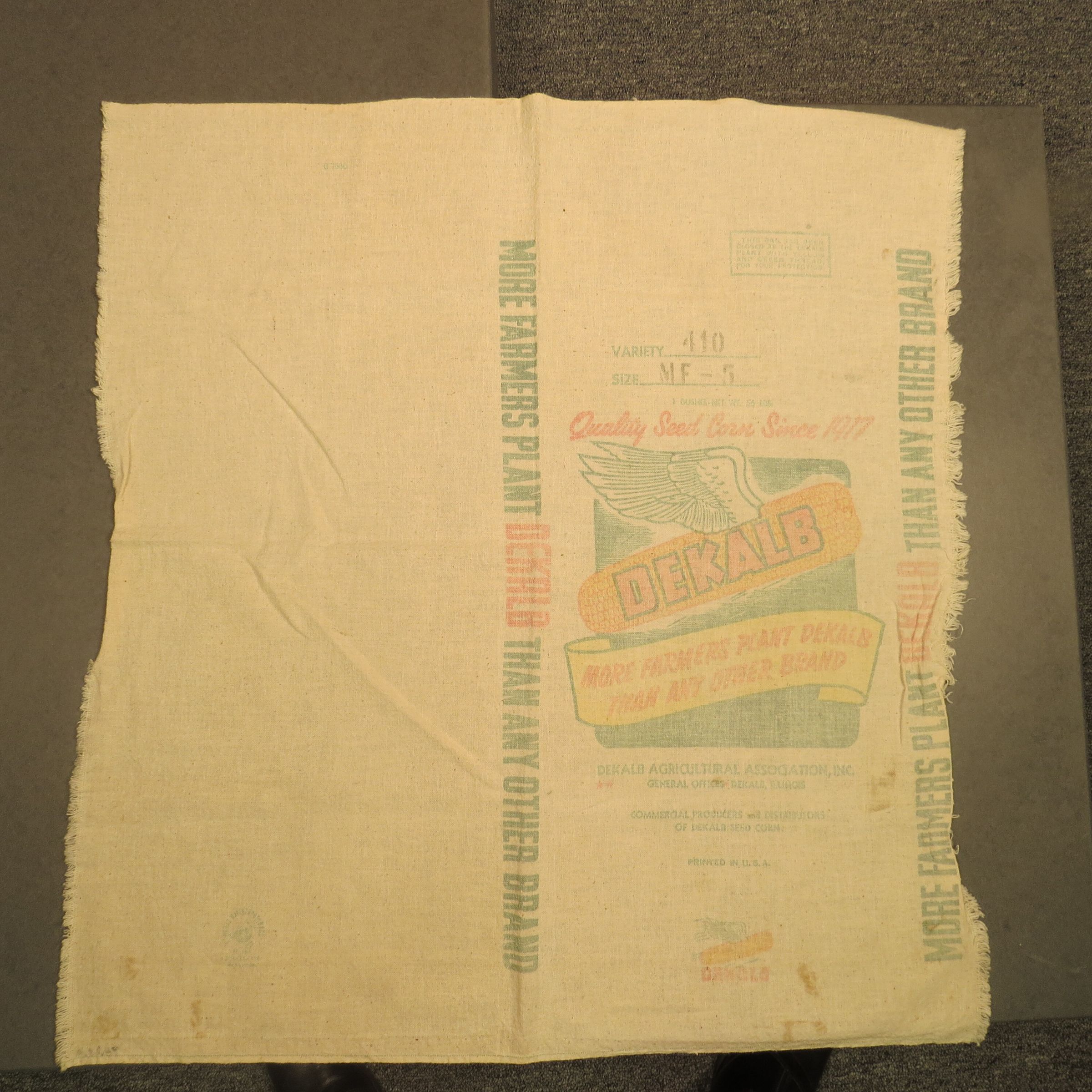 Tan seed bag. Green, yellow and red design. Green background with yellow corn and the word "Dekalb" is over the corn. White wings are attached to the top of the corn cob. Coarser tan fabric with a loose weave. Text reads, "Quality Seed Cron Since 1917 / Dekalb / More Farmers Plant Dekalb Than Any Other Brand / Dekalb Agricultural Association, INC / General Offices, Dekalb, Illinois / Commercial Producers and Distributors / Of Dekalb Seed Corn" "Variety 410, Size MF-5". The bag measures 28" (w) x 31" (l).Collection