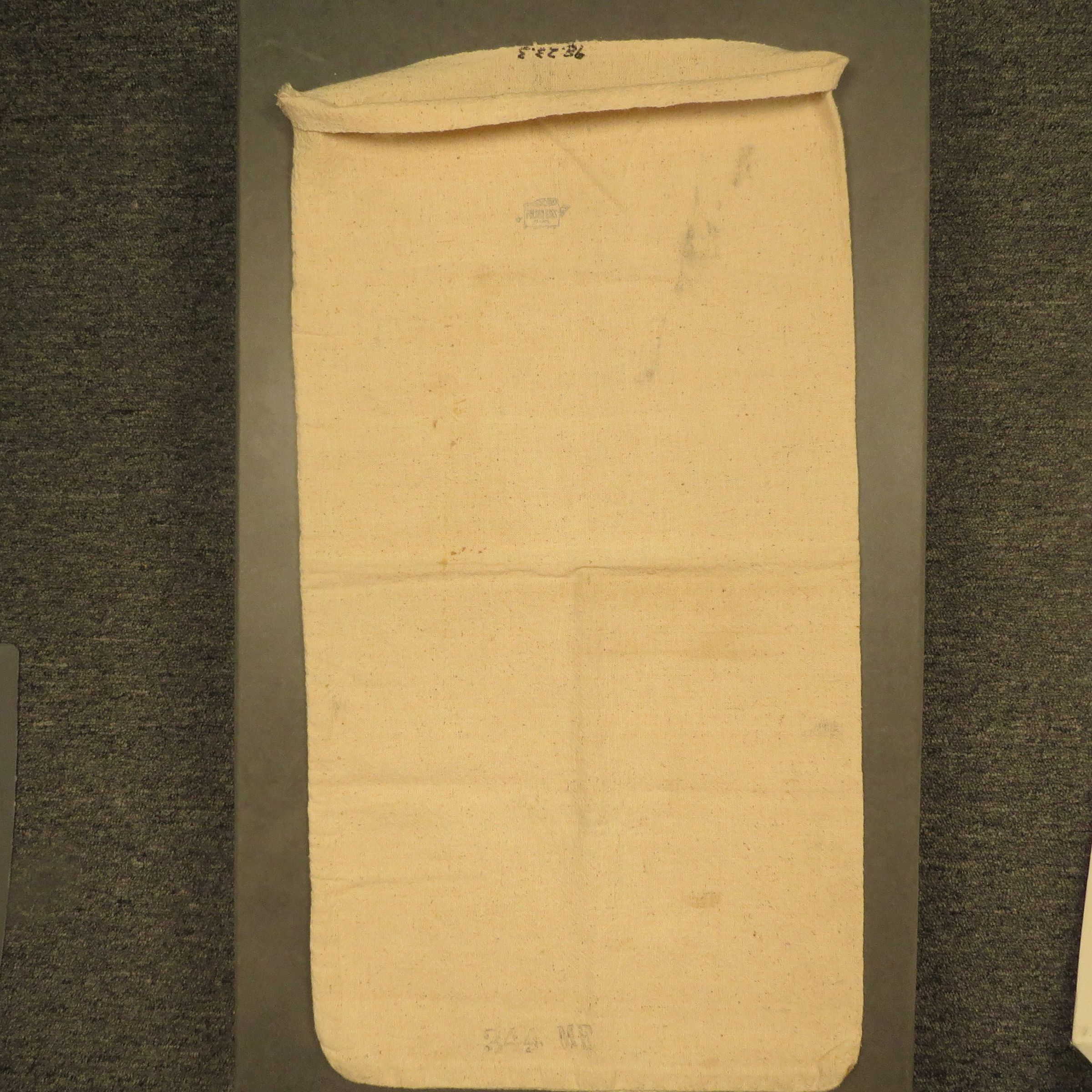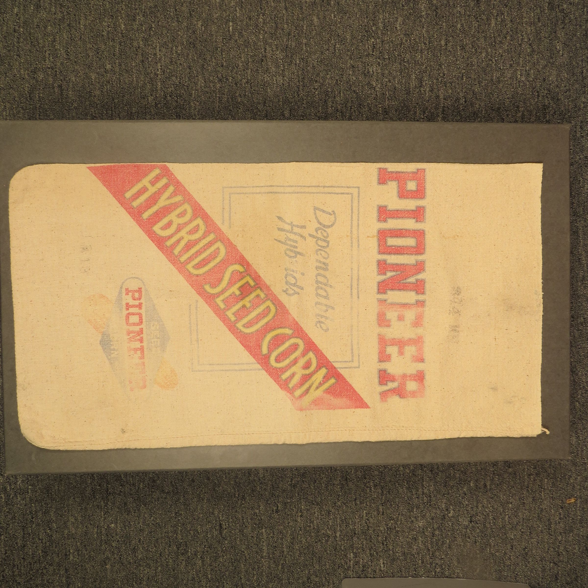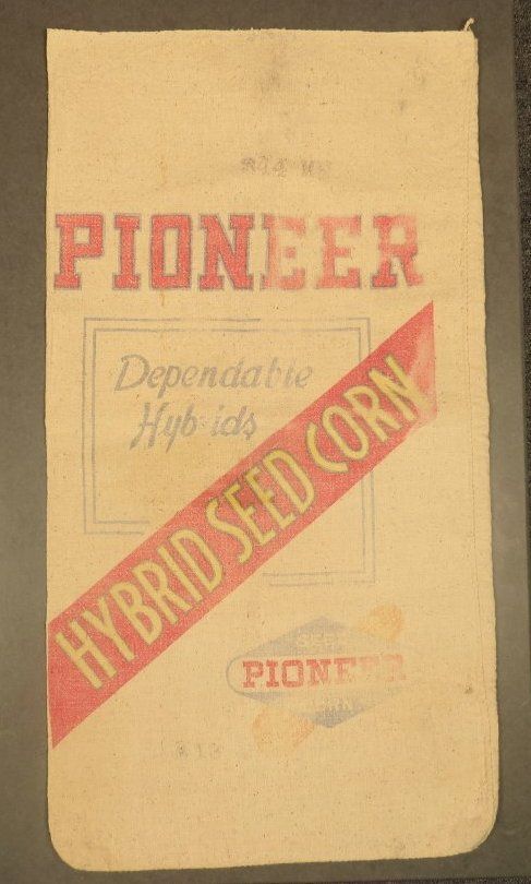This is a corn seed bag made of a coarse tan fabric. The bag has a red stripe diagonally across the center. On the front of the bag is the text, "Pioneer / Dependable Hybrids / Hybrid Seed Corn / Pioneer". Some numbers and letters have been stamped at both front top and back bottom. The seed bag measures 15" (w) x 28" (l).