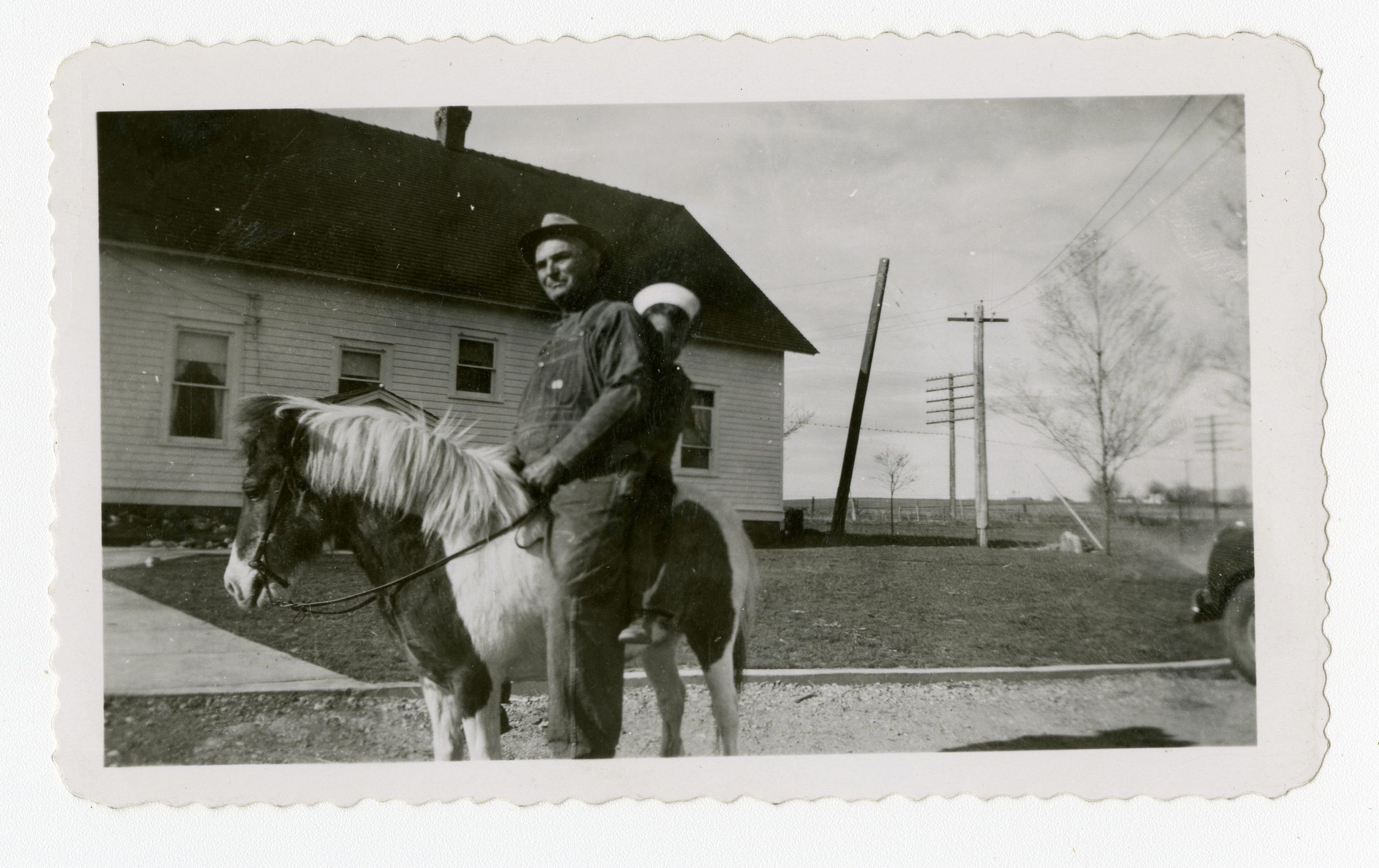 Black and white photograph of a man and a boy on a pony. The photograph was taken outside. There are power lines in the background. The man is wearing overalls and a hat. He is identified as Albert Brunner. The boy is identified as Lester K Brunner. The pony is named Sweetie.