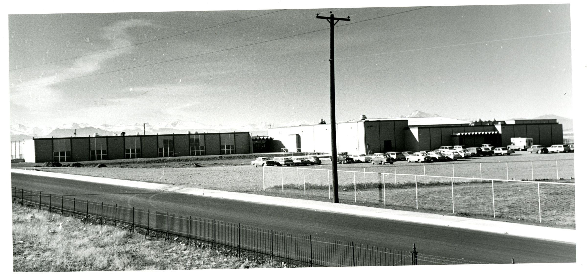 Broomfield High School 1965 - Shows building, parking lot, mountains in background