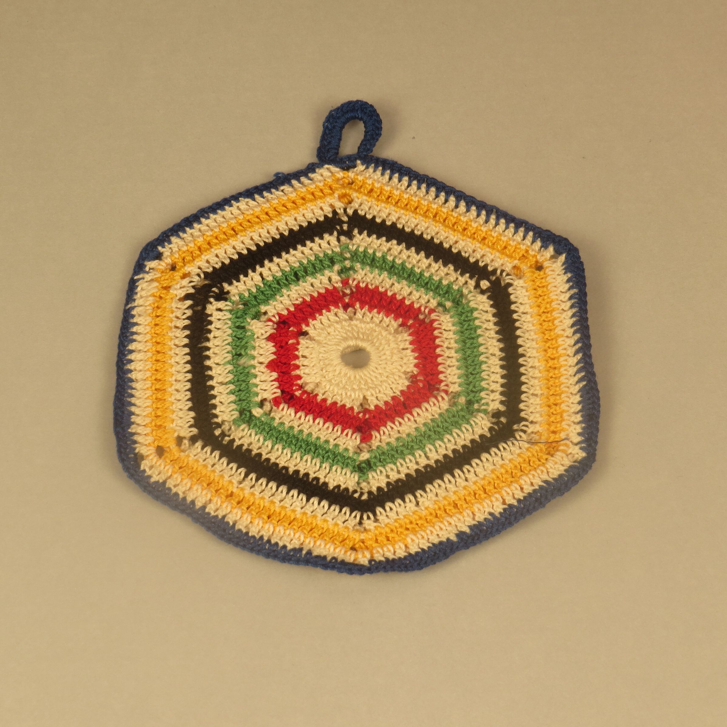 This is a hexagonal hot pad made with multiple yarn colors. Blue, yellow, black, green and red are displayed in contrast to white yarns between the colors and at center. There is a blue loop at top to hang the hot pad. The hot pad measures 5.5" (w) x 5.5" (l).
