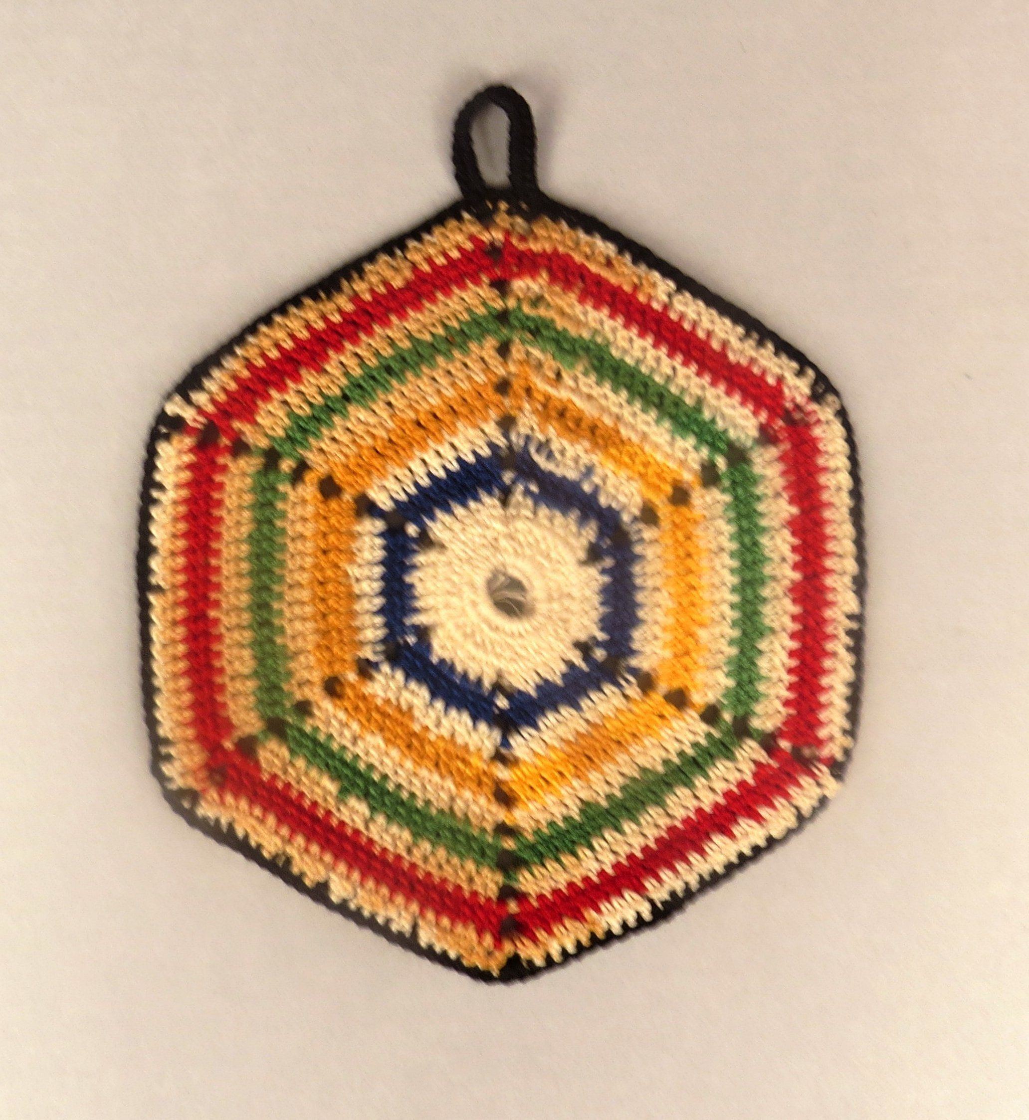 This is a hexagonal hot pad made with multiple yarn colors. Black, red, green, yellow and blue are displayed in contrast to white yarns between the colors and at the center. There is a blue loop at top for hanging the hot pad. The hot pad measures 5.5" (w) x 5.5" (l).