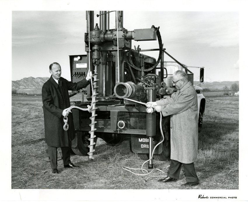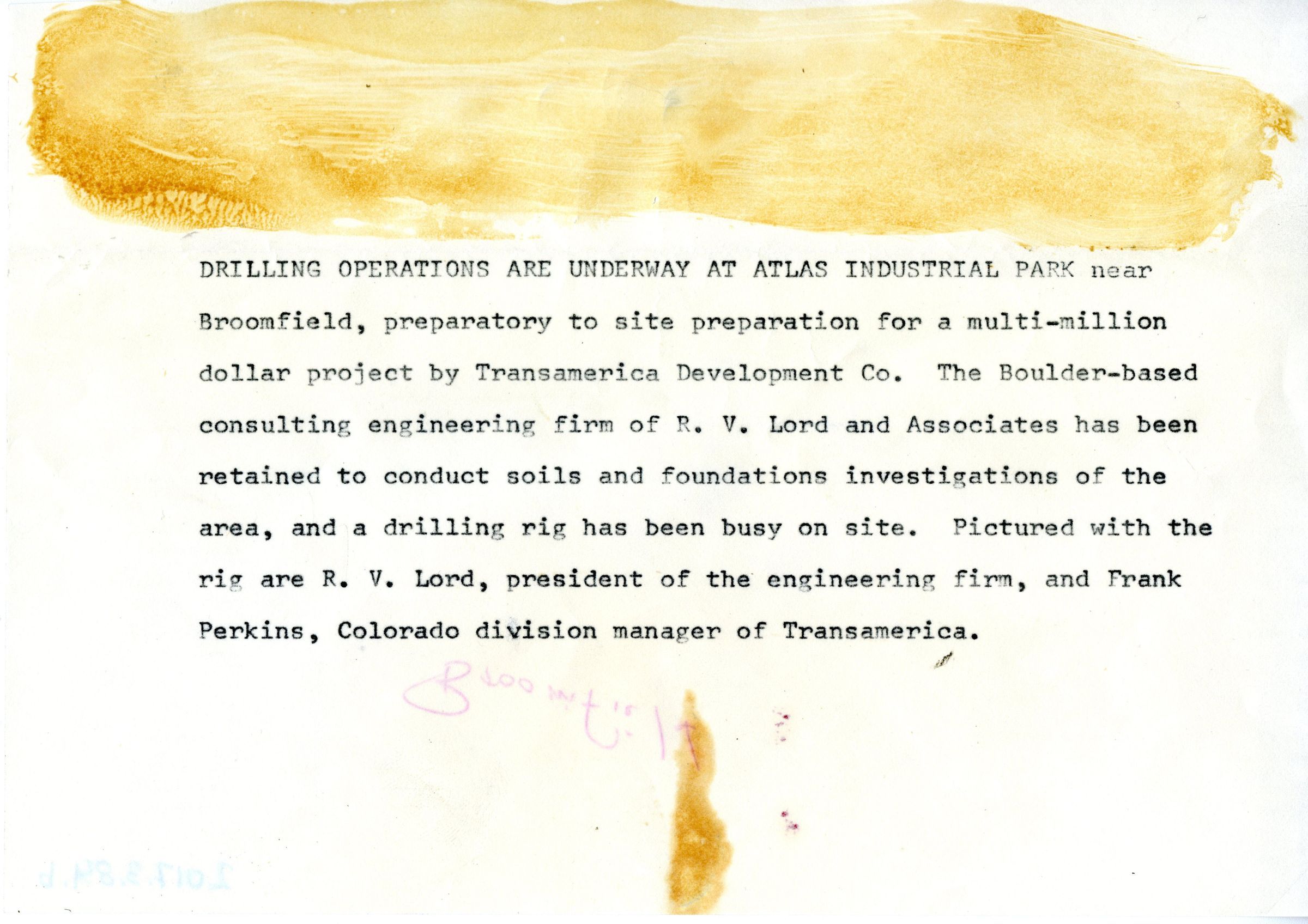 Photo and corresponding paper with description reading, "Drilling Operations are underway at Atlas Industrial Park near Broomfield, preparatory to site preparation for a multi-million dollar project by Trasamerica Development Co. The Boulder-based consulting engineering firm of R.V. Lord and Associates has been retained to conduct soils and foundations investigations of the area, and a drilling rig has been busy on site. Pictured with the rig are R.V. Lord, president of the engineering firm, and Frank Perkins, Colorado division manager of Transamerica."Collection