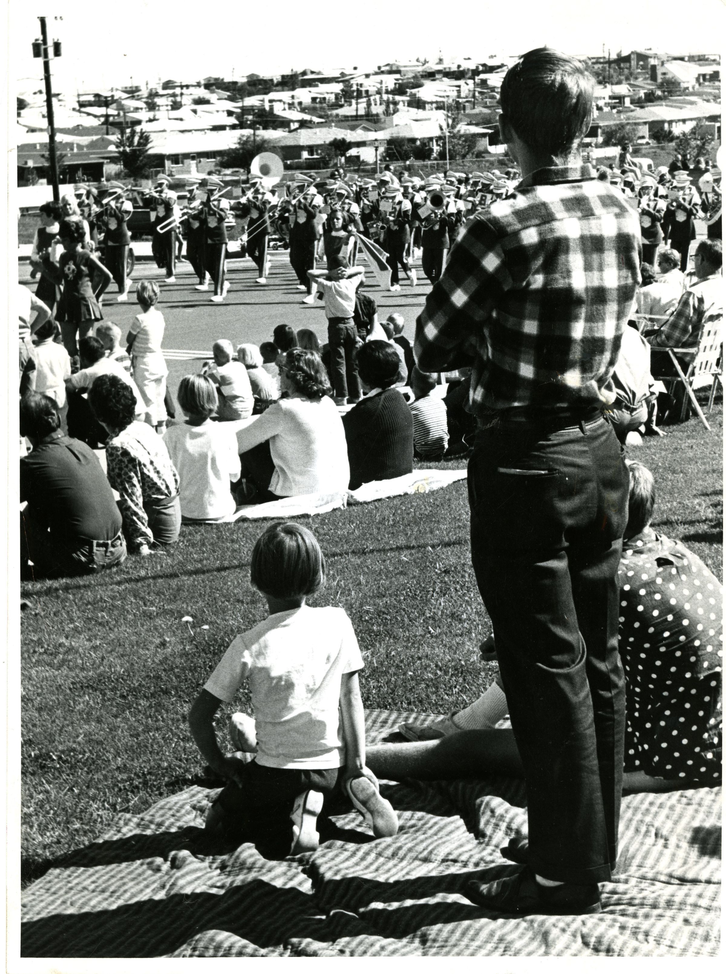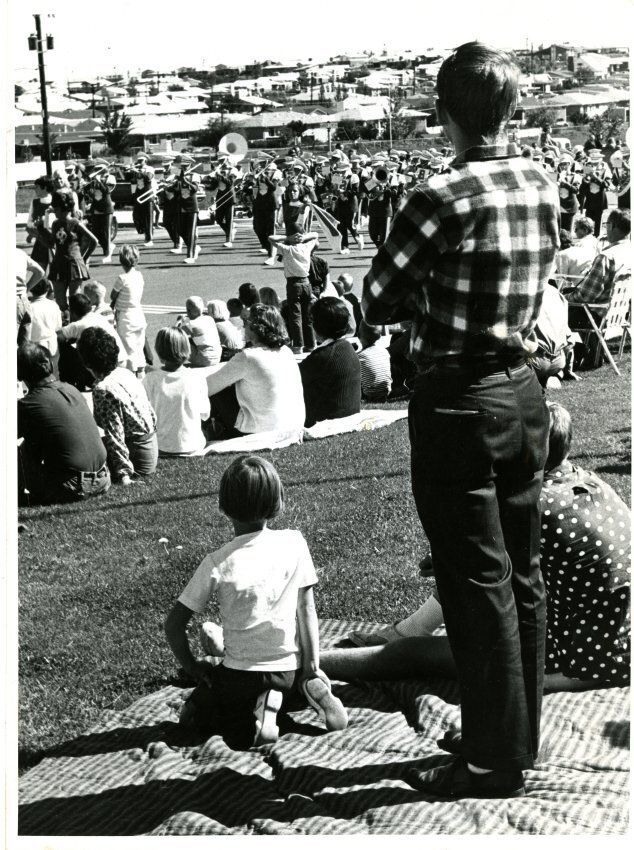 Marching Band - Parade - with spectators in foreground Broomfield Days? Caption: "They Marched and Marched"
