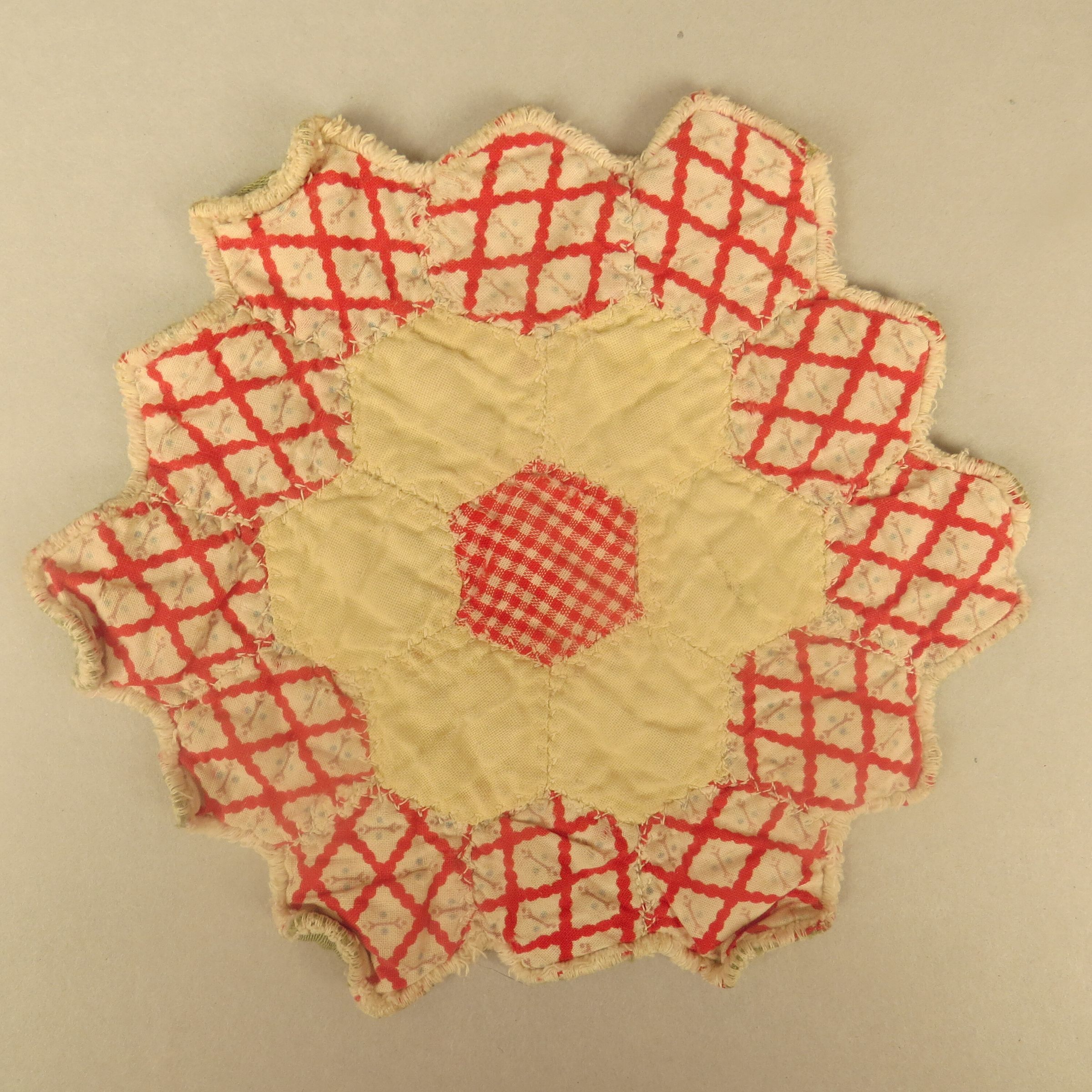 Hexagon shaped hot pad made in a "grandmother's flower garden" style with small hexagon shapes pieced together to create a larger hexagon shape. The center is a red calico that is then surrounded by a pale yellow, and then a larger scale red grid pattern. It has been machine bound around the outside. The hot pad measures 6" (dia).