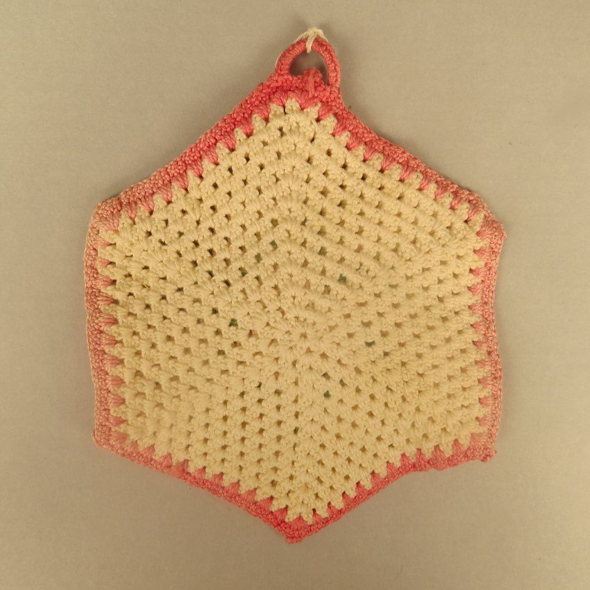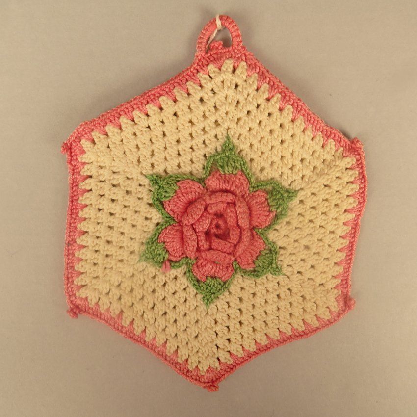 Hexagon shaped potholder with cream colored crocheted center. There is pink yarn around the outside and a pink yarn loop at top. On the front is a flower made out of pink yarn that is 3-D and it is surrounded by green yarn leaves. The potholder measures 6" (w) x 6" (l).