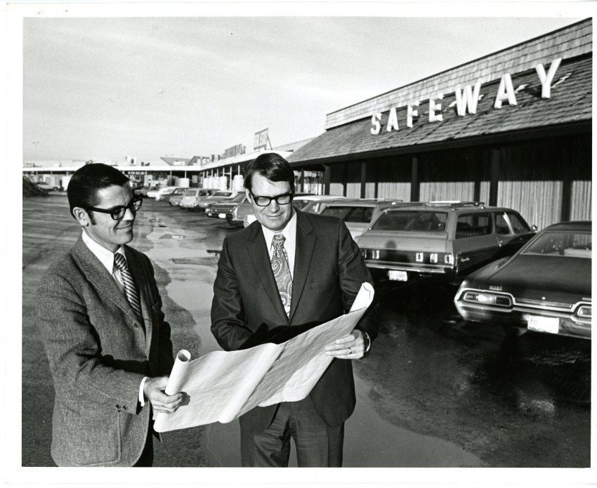 A photo of Robert C. Ide, division manager of Transamerica and Glendon R. Anderson, director of development of Facilities Planning, holding a piece of paper and standing in a parking lot on January 16, 1972.Collection