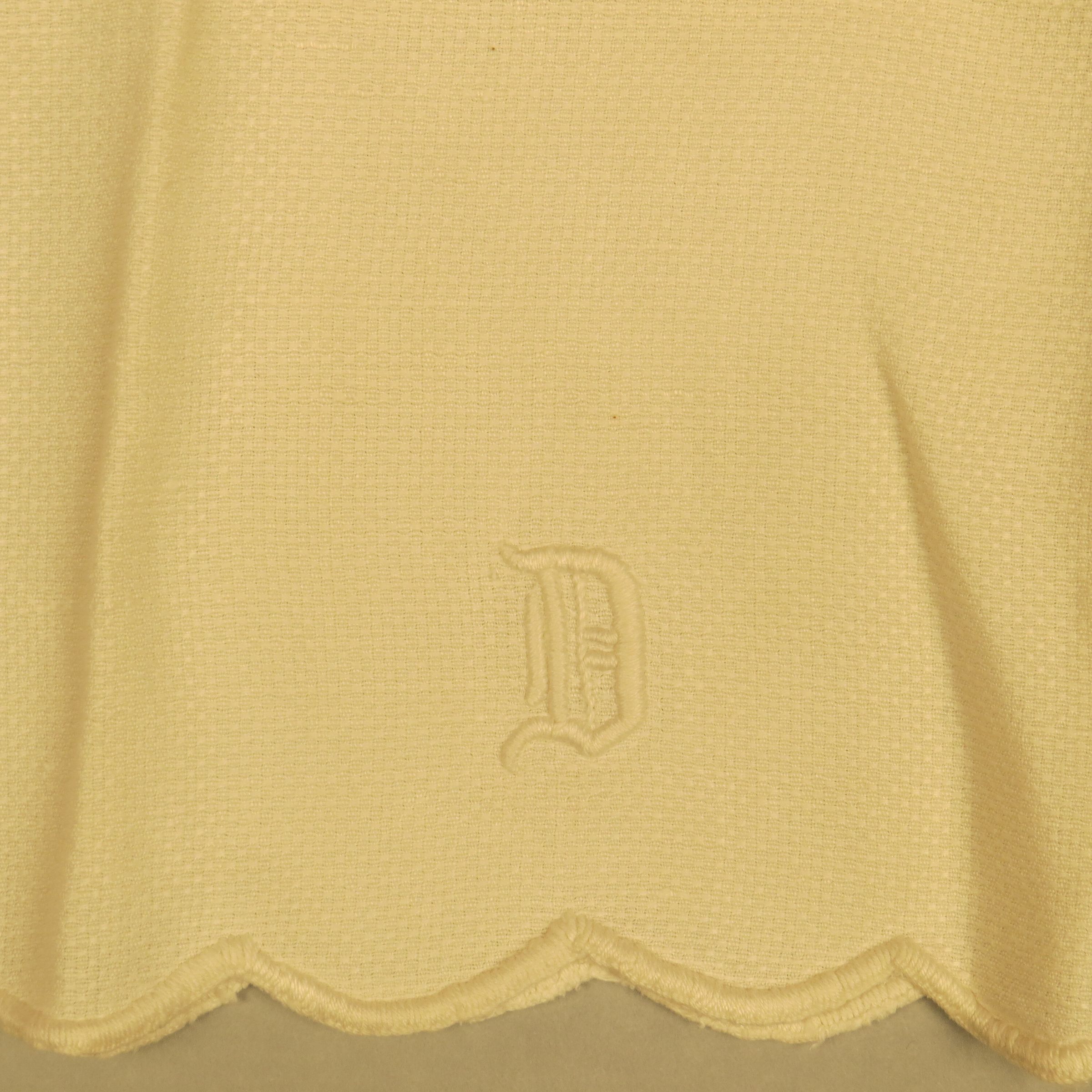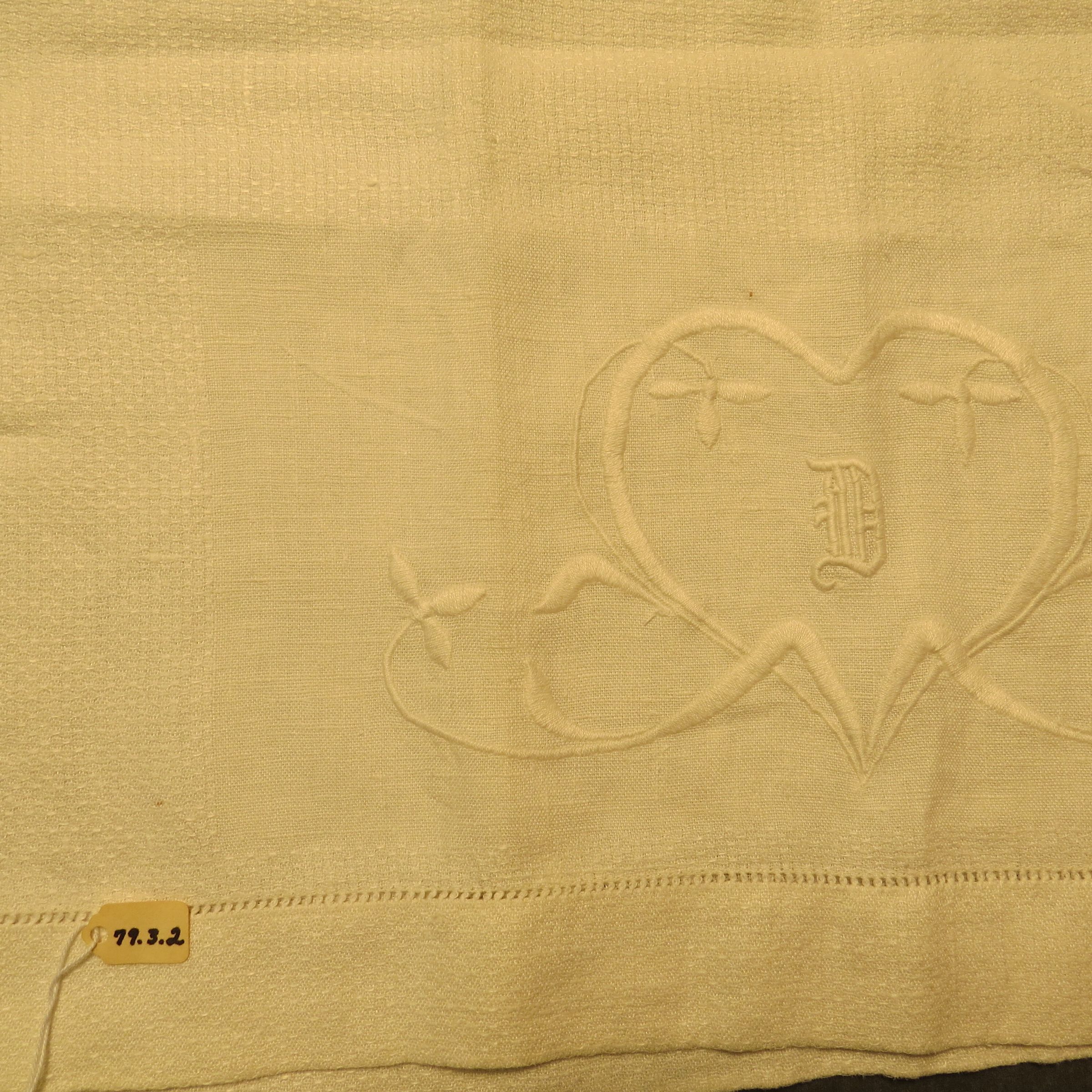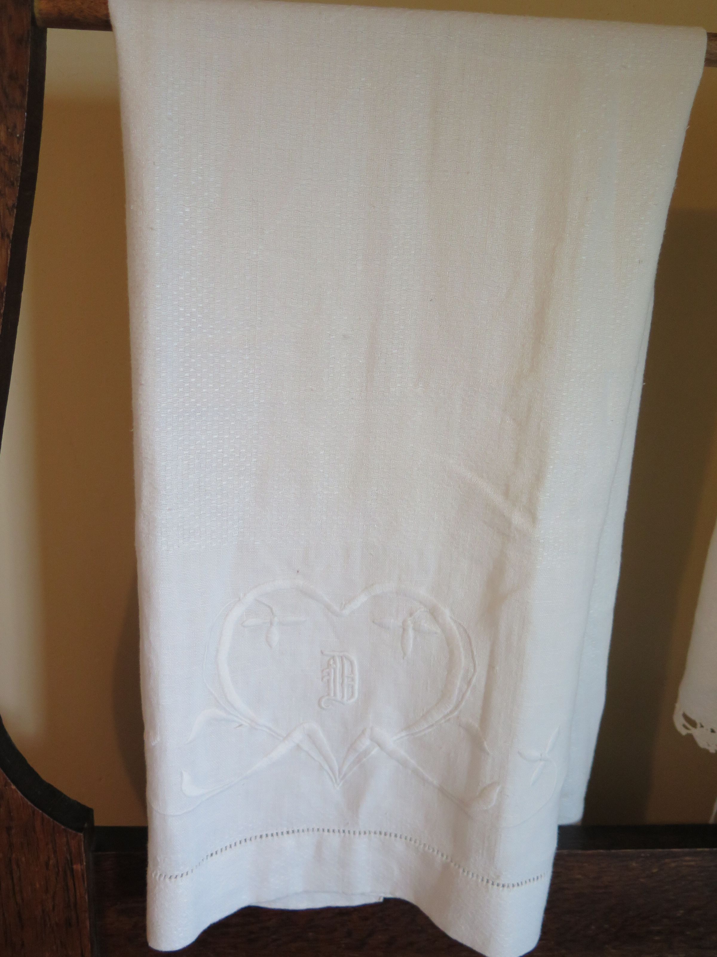 White tea towel with hemstitched hems and a large embroidered heart at the bottom of one short side that has an embroidered D that is slightly 3-D. The towel measures 38" (w) x 19" (l).