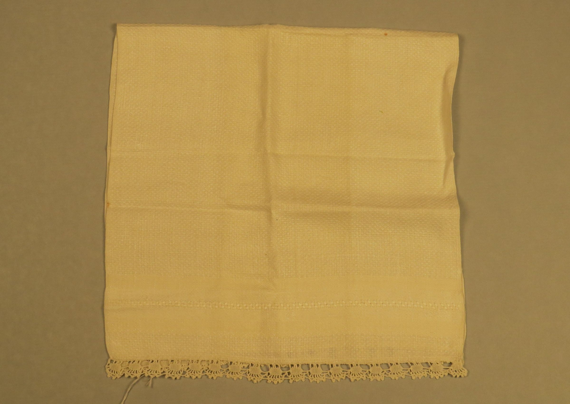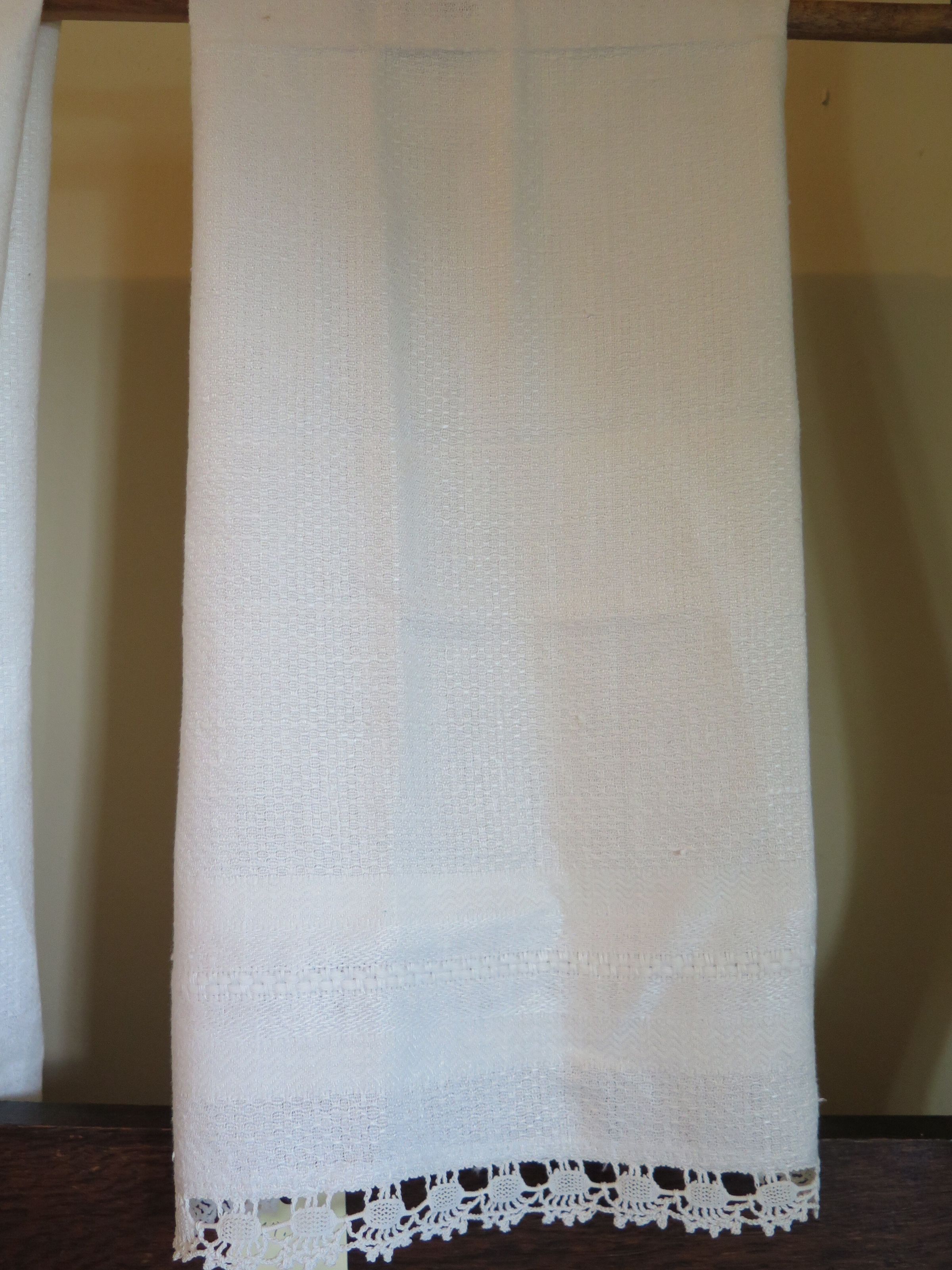 Off-white guest towel with very decorative textured weave. The lace on both short ends was hand crocheted by Broomfield resident Viola Crooks. Towel measures 15" (w) x 30" (l).