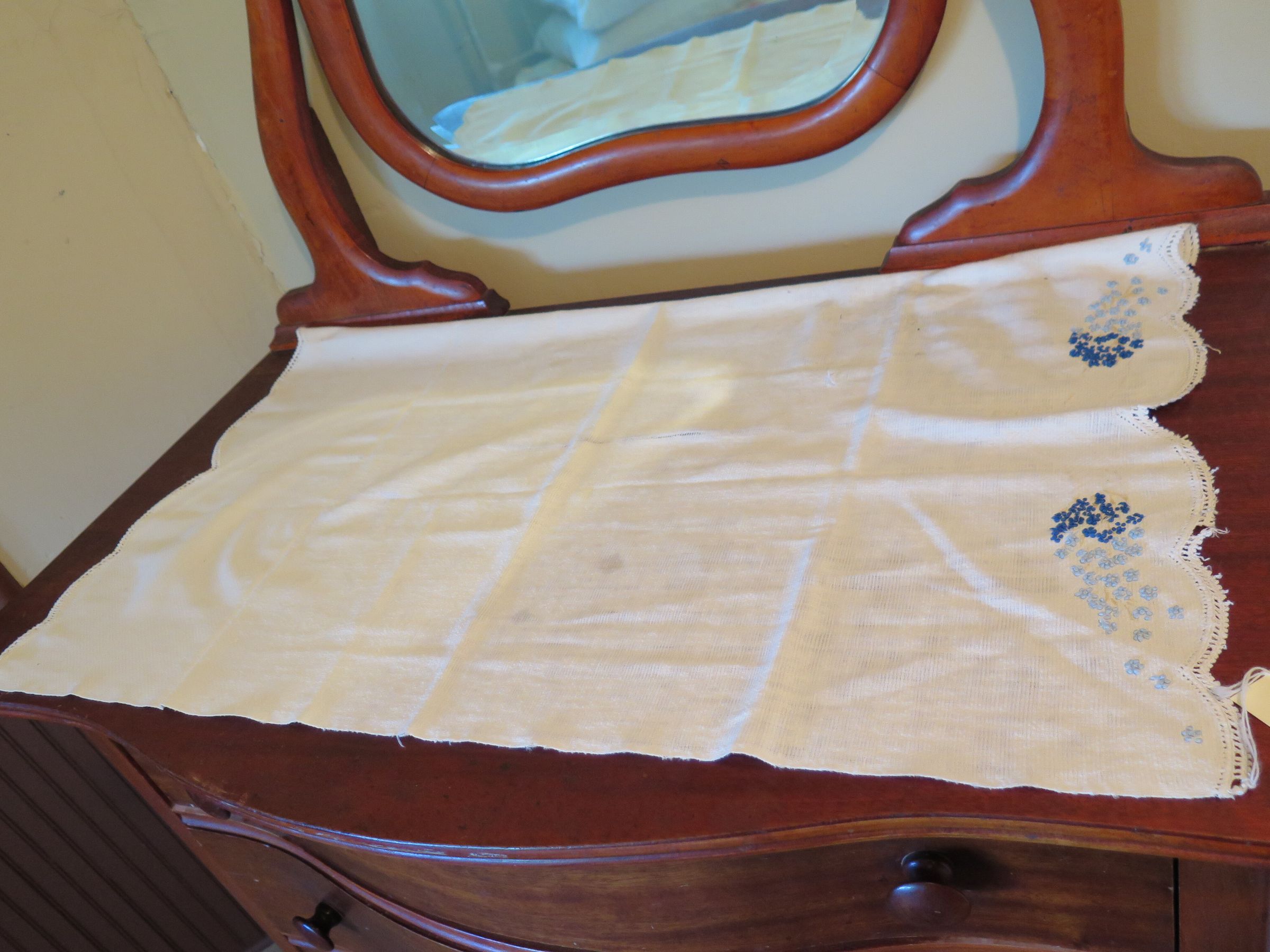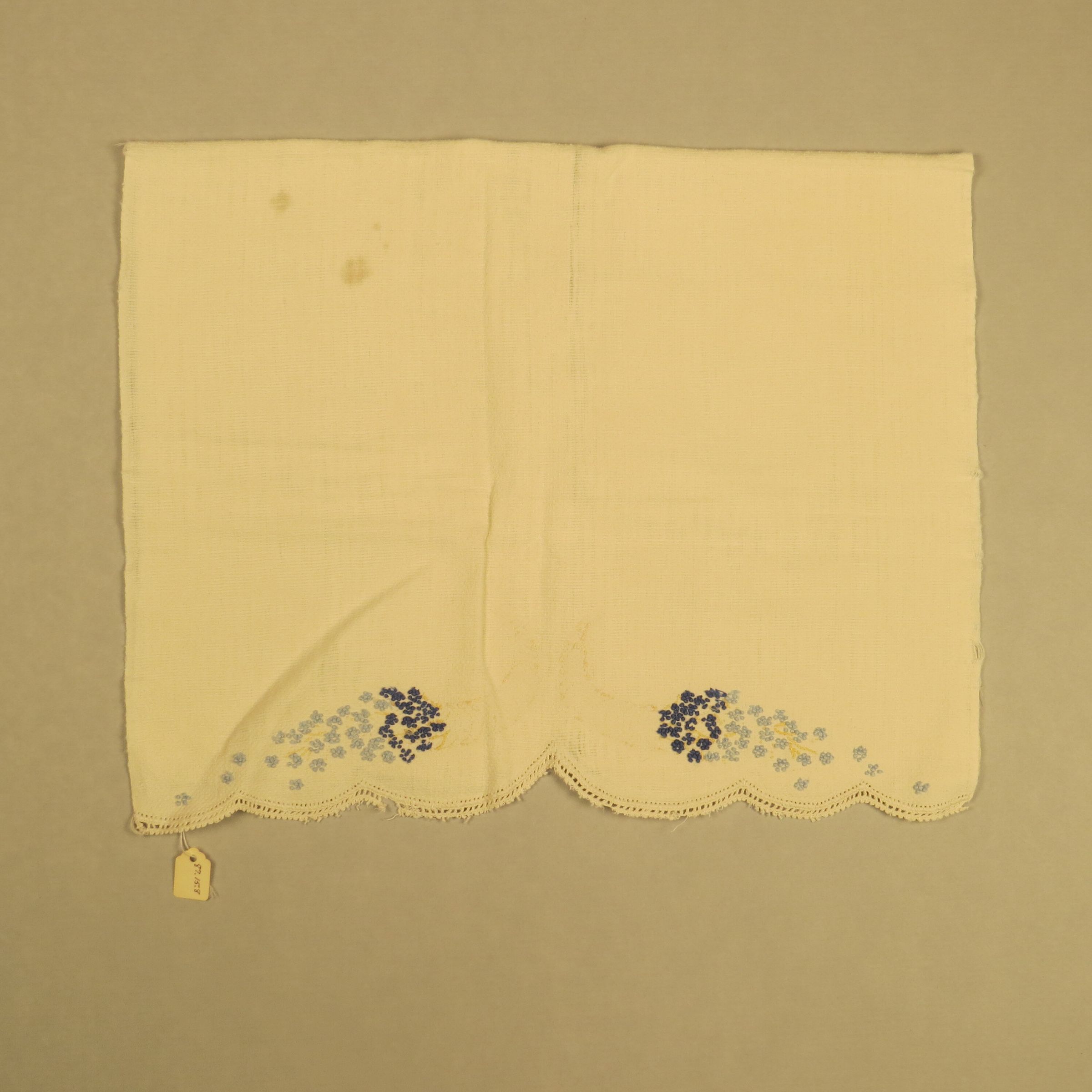 White towel with scalloped edges on the short ends. There is blue and light blue embroidery at the ends that is done with popcorn stitches to show flower like shapes. Towel measures 18" (w) x 28" (l).