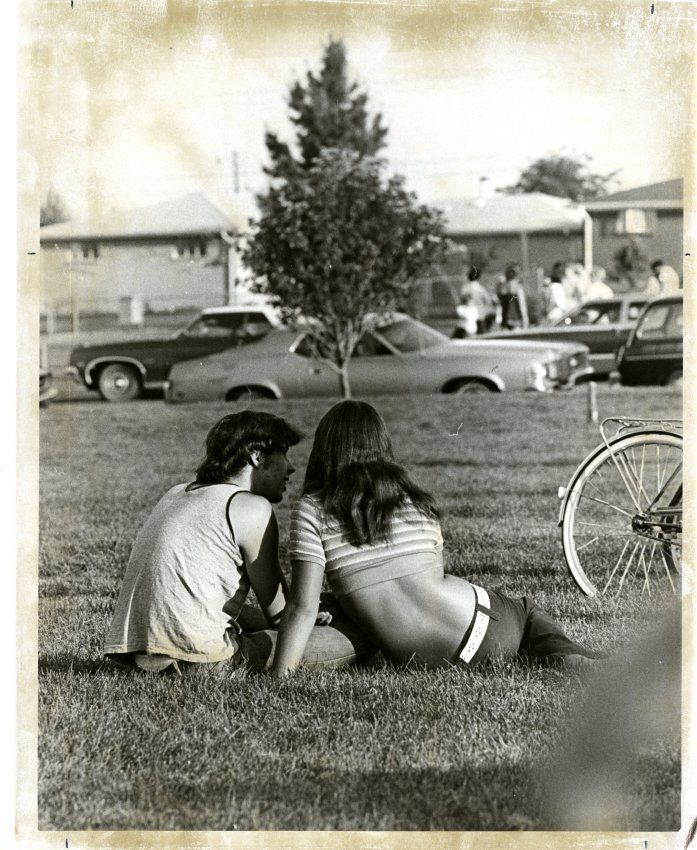Caption: Lovers Lovers - Two teens sitting in Midway Park - Broomfield Fun Day 1973