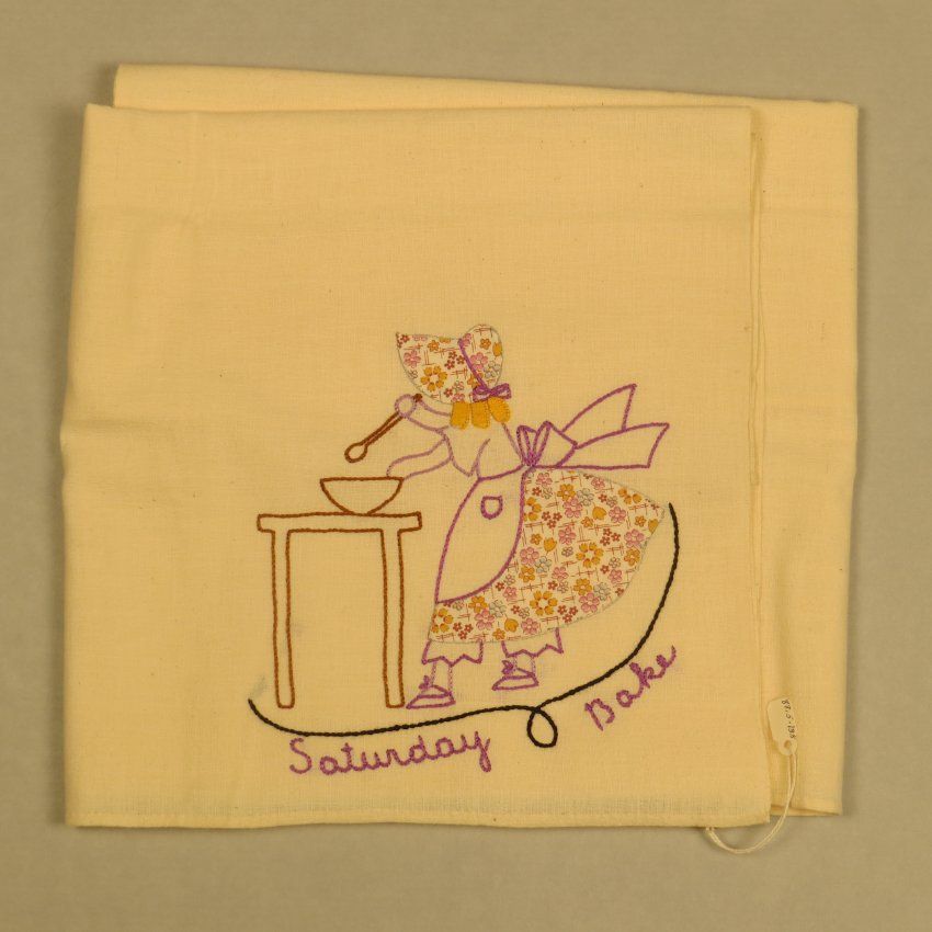 This is a white tea towel with an embroidered design in one corner. The image is of a woman baking. Her dress and sunbonnet are appliqued on but the rest of the design is embroidered. The words "Saturday Bake" have been embroidered under the woman. The tea towel measures 34" (w) x 36" (l).