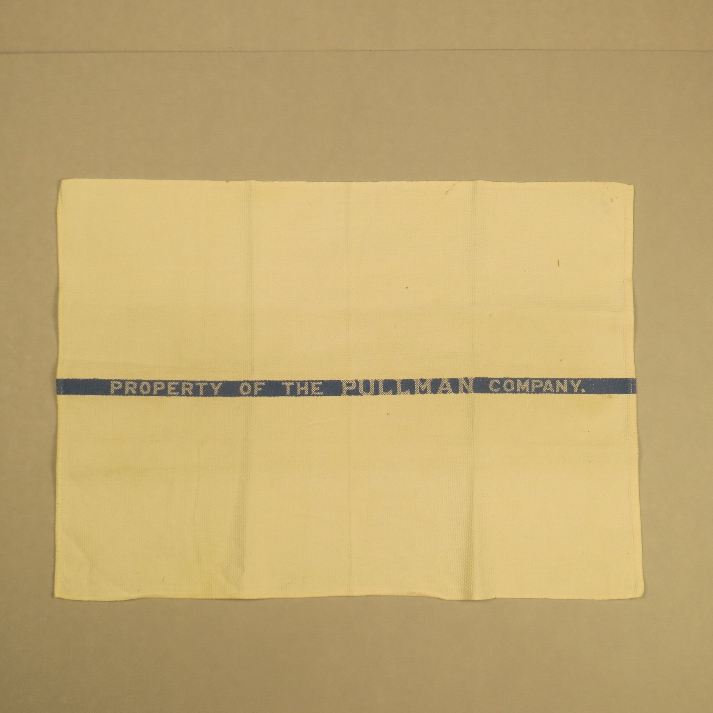 This is a white towel with blue stripe down the middle of the length. In the middle of the stripe are white words: "Property of the Pullman Company". Towel measures 16" (w) x 24" (l).