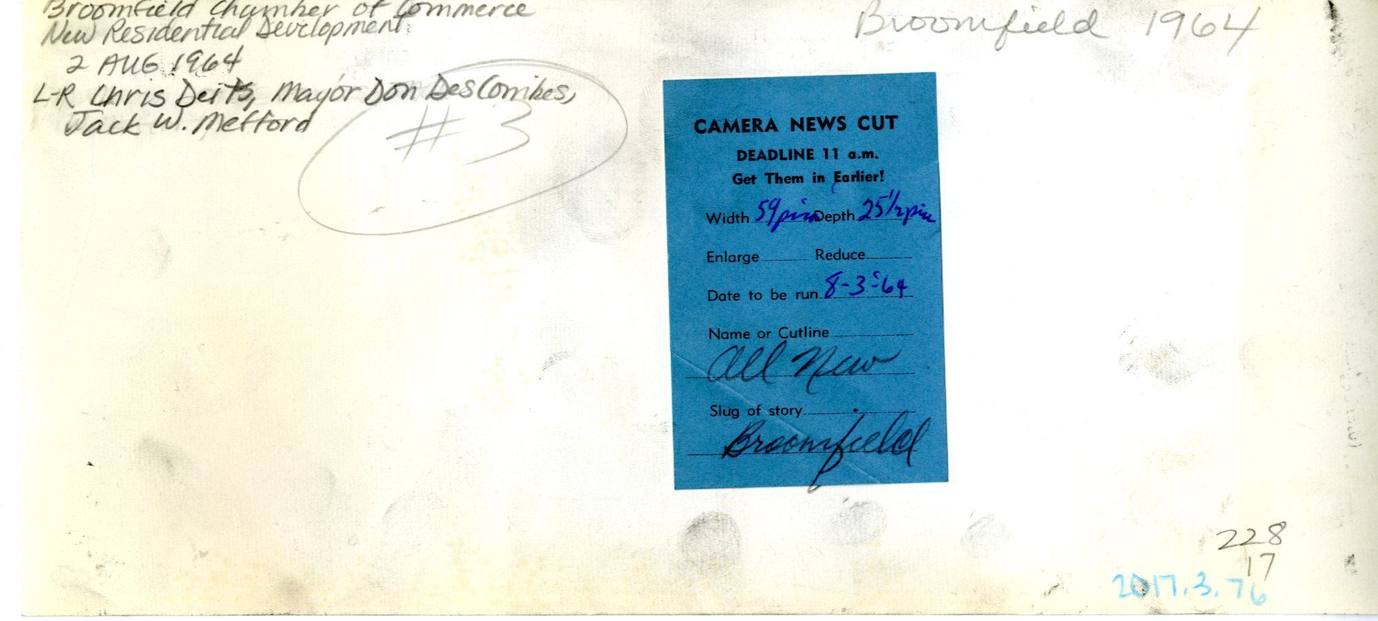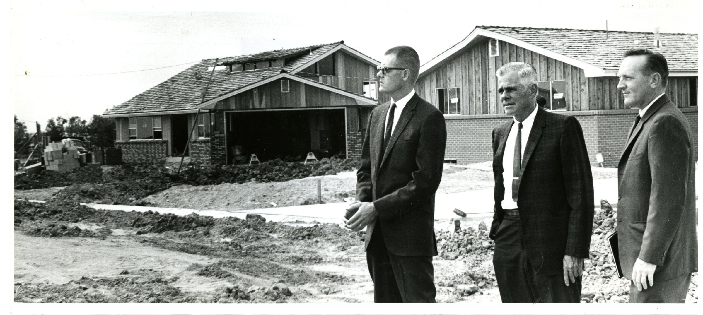 Photo of (L-R) Chris Deitz, Mayor Don DesCombes, Jack W. Mefford in front of new houses. Aug 2 1964.