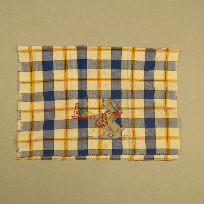White, yellow and blue plaid tea towel with applique of a dog carrying a tray on one end. On top of the applique is embroidery. The tea towel measures 16.5" (w) x 23" (l).