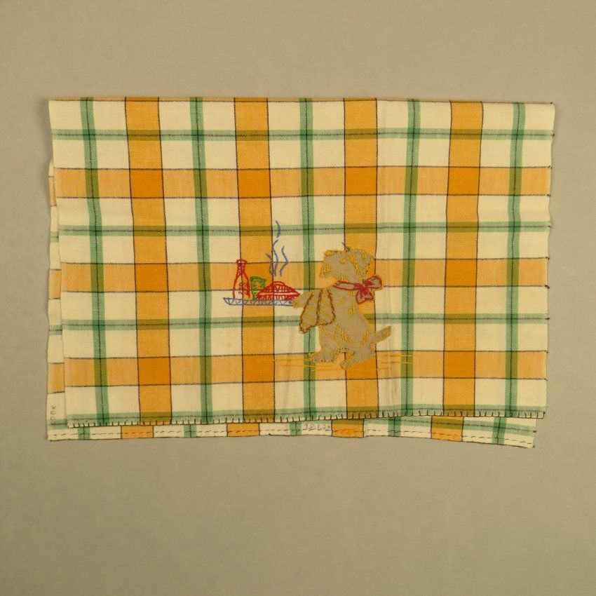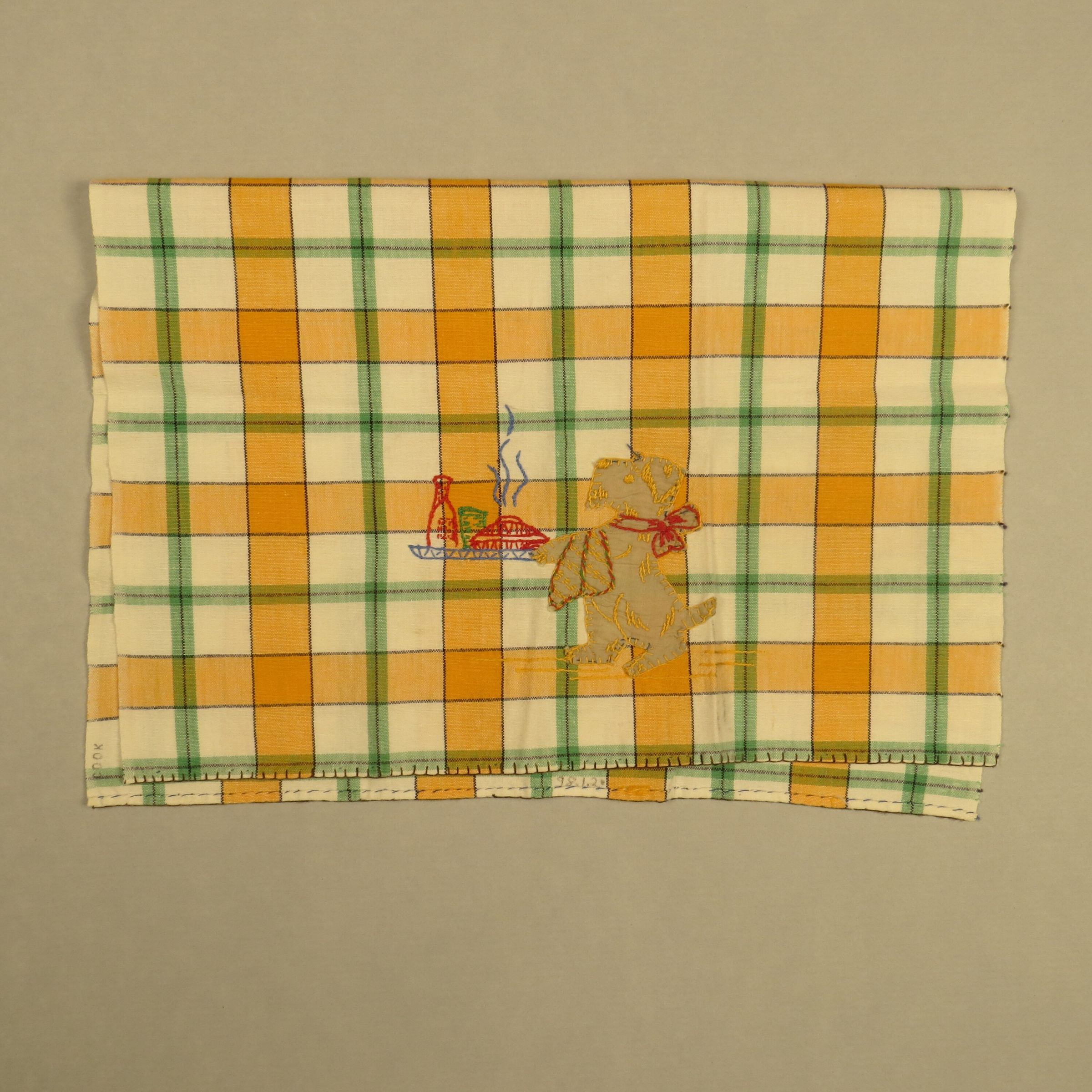 White, yellow and green plaid tea towel with applique on one end of a dog carrying a tray. On top of the applique is embroidery. The tea towel measures 16" (w) x 22.5" (l).