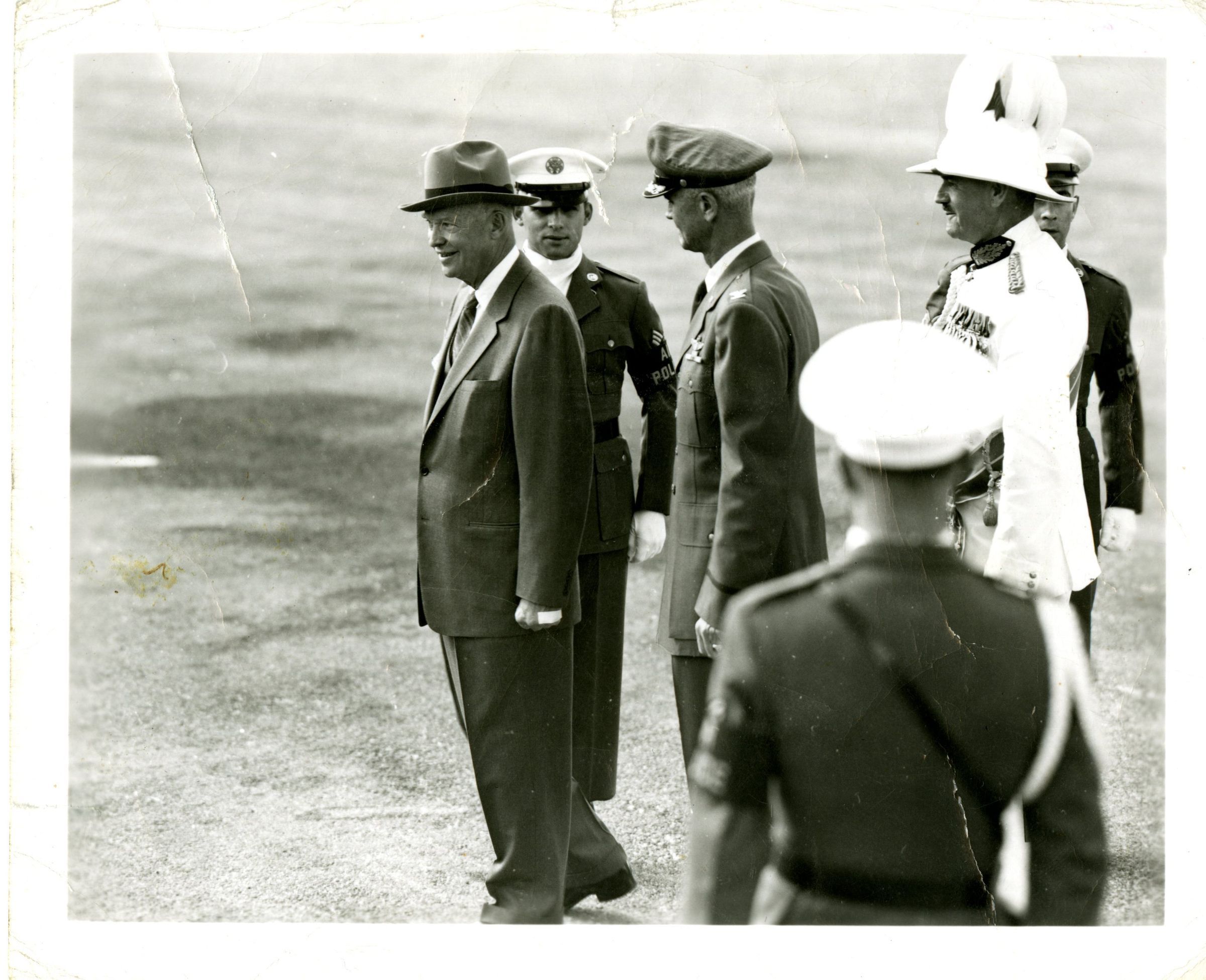 Photo of Dwight D. Eisenhower in civilian dress surrounded five other men in military uniform. They appear to be standing on an airplane strip. Photo has no identifying information or date. This may have been taken when Eisenhower visited Broomfield/Colorado, but not for certain.