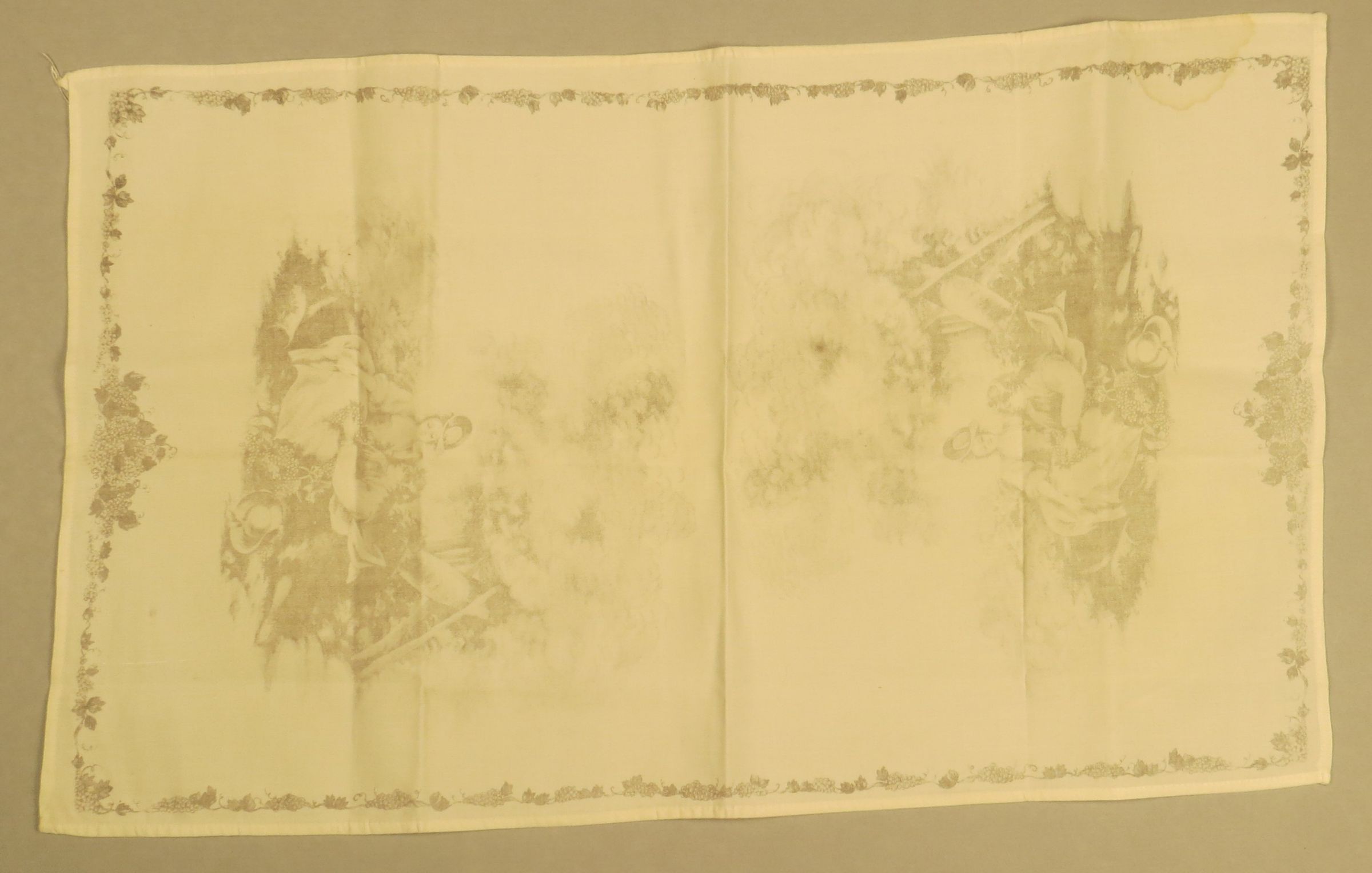 White towel with a printed symmetrical design that looks like Toile printed design. There is a similar styled border around the outside. The design appears to be gray now, though it may have been another color originally. It may be fading. The towel measures 16.5" (w) x 27.5" (l).Collection
