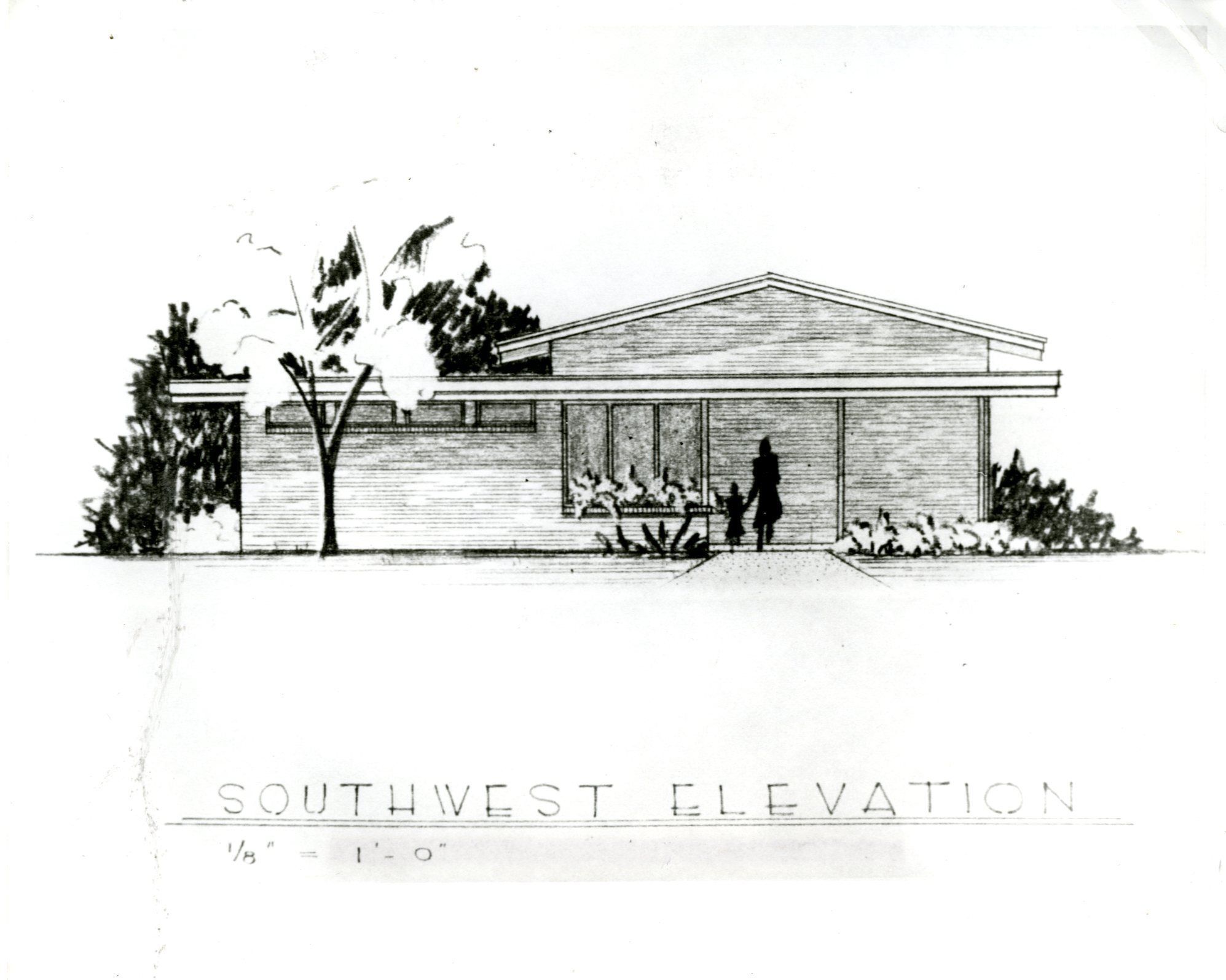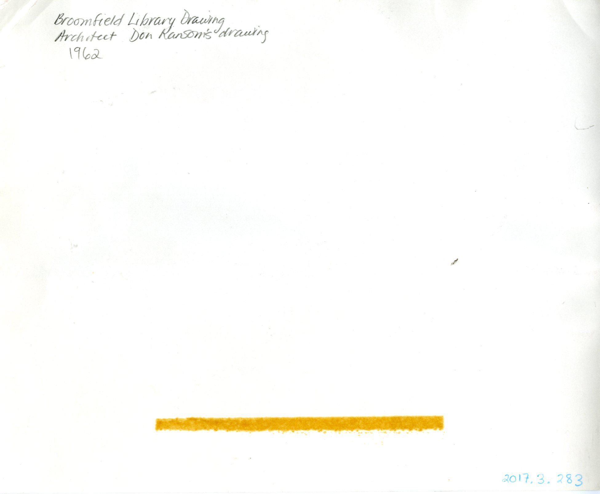 Black and white drawing of the Broomfield Library, southwest elevation, by architct Don Ransom.