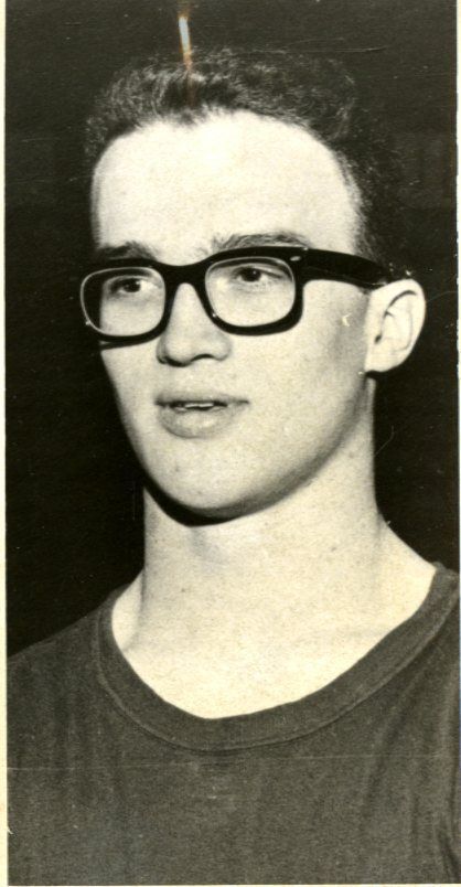 Black and white, 1X3 photo of Jerry Hillis, wearing dark t-shirt and black rimmed glasses.