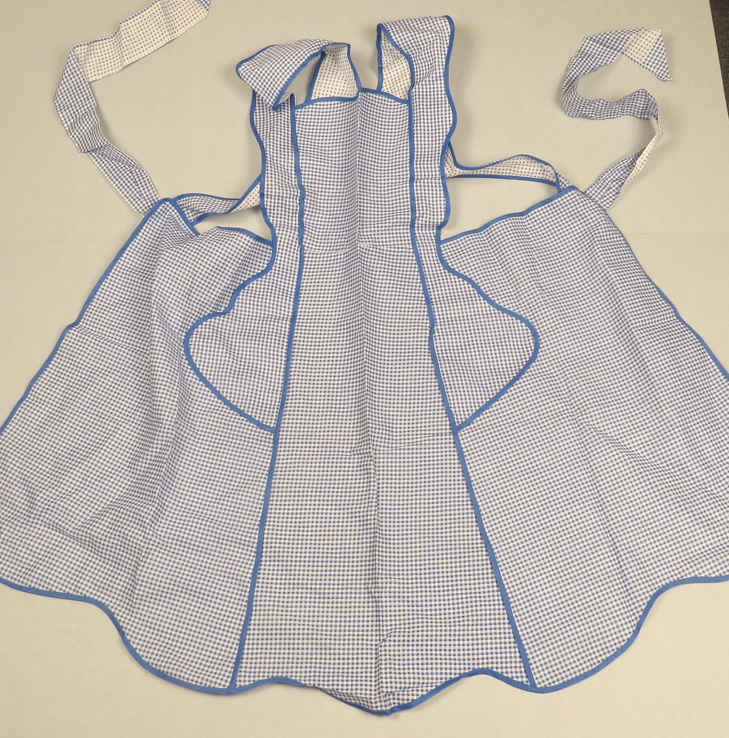 Blue printed (not true) gingham in a bib-style apron with blue binding in a princess style cut and a large scalloped bottom. The blue binding is a bias strip. Apron measures 19" (w) x 33" (l).Collection