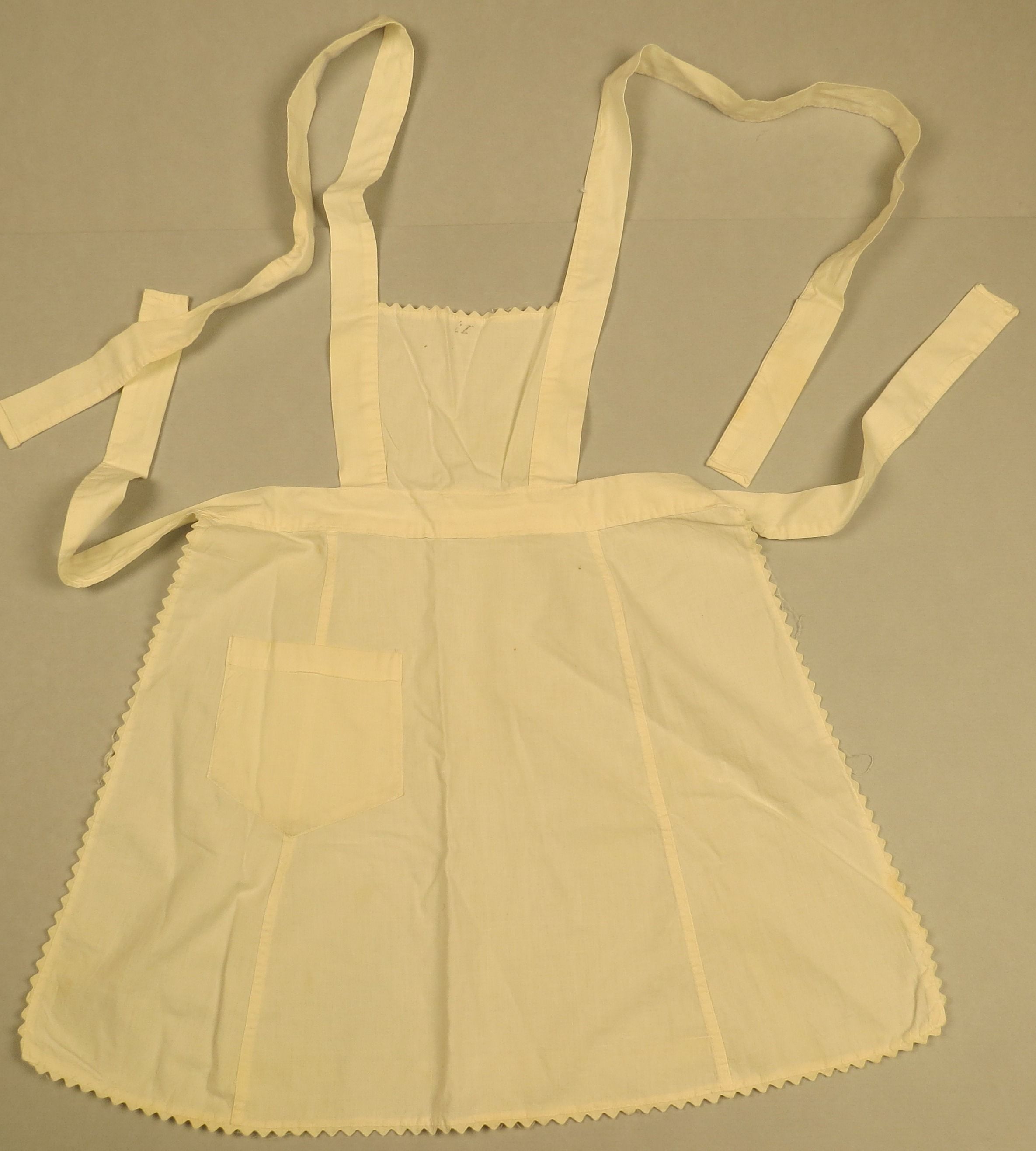 White muslin apron with small bib-style front. Pocket on wearer's right side of bottom. Matching rick rack around outside. Apron measures 22" (w) x 23" (l).Collection