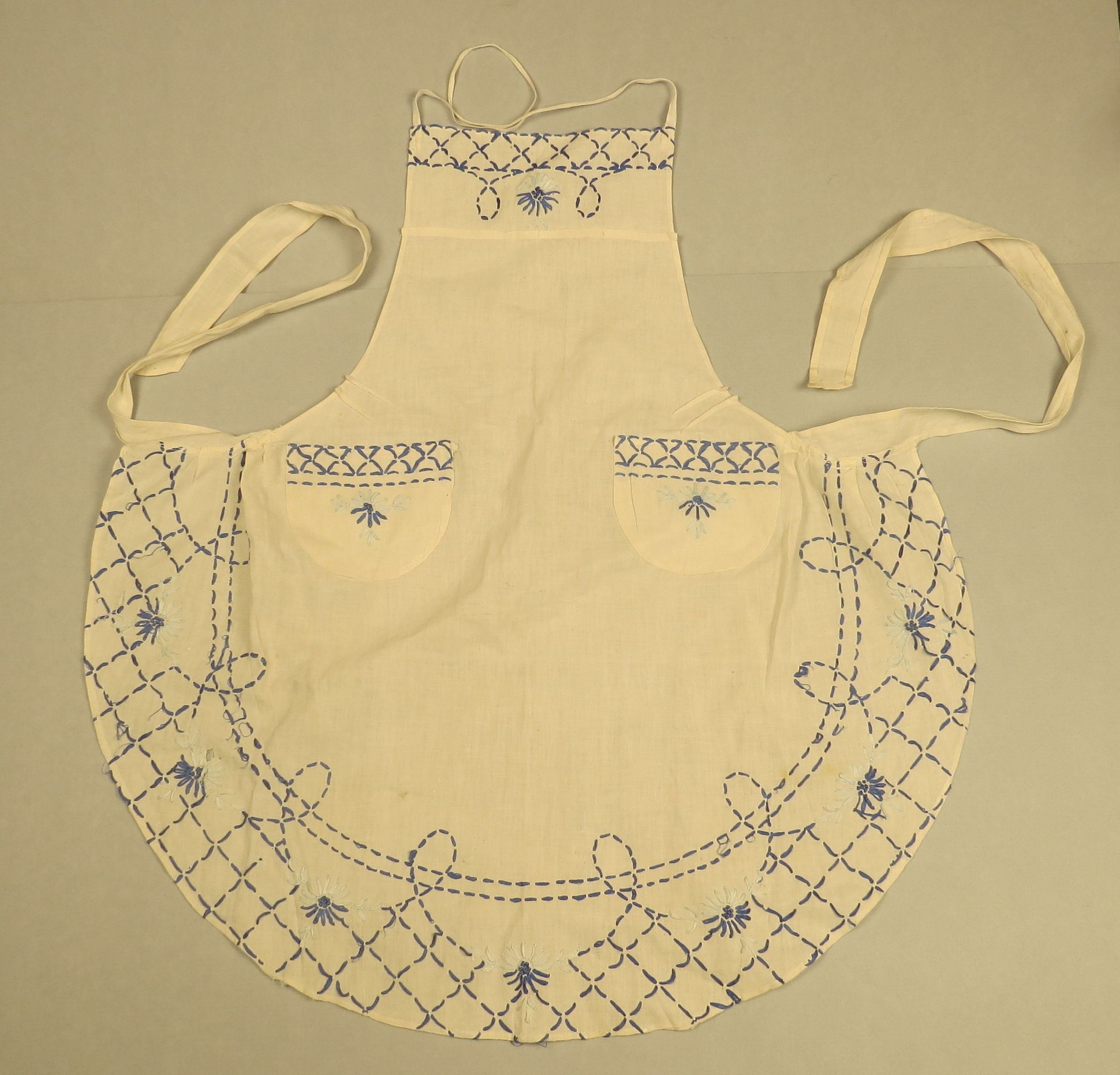 White bib-style apron with large circle shaped skirt decorated with blue embroidered grid and flowers. There are two central pockets, ties for behind the back and a loop for the head. The apron measures 14" (w) x 28" (l).Collection