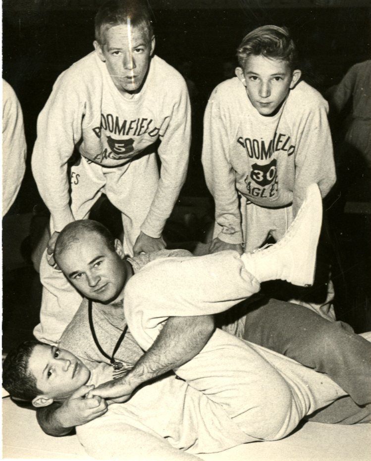 Black and white photo of three Broomfield Eagle wrestlers. Coach is demonstrating wrestling hold with one of the players. Identified as Assistant Wrestling Coach Clark Defler with Bob Elliot in Cradle Hold.