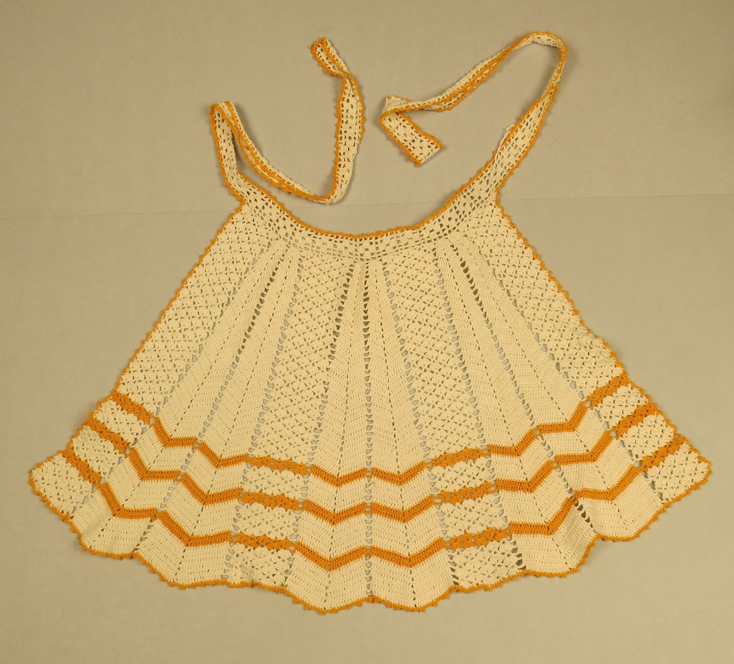 This is a cream colored apron with gold stripes along the bottom and around the edges (including the ties). The apron is crocheted with triangular sections to give it a skirt shape which is more full at the bottom and narrows at waist. The apron measures 20" (w) x 20" (l).Collection