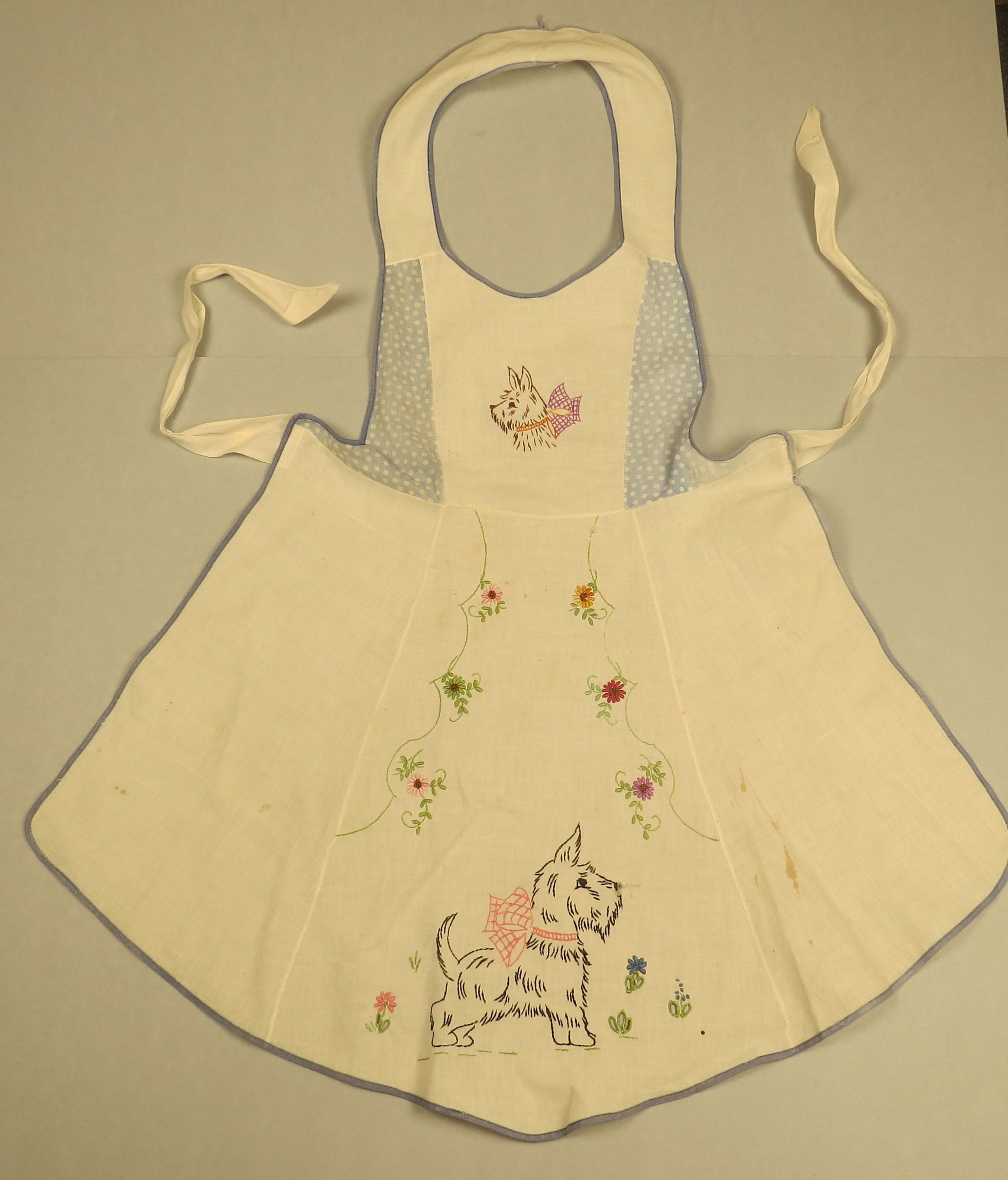 This is a white apron with blue and white polka dot panels on the top bib section at the sides. There is blue binding around bottom. The embroidery on the front of the apron is of a scotty dog profile at the top and the whole dog at the bottom. There are flowers embroidered down the sides of the apron. The apron measures 16" (w) x 28" (l).Collection