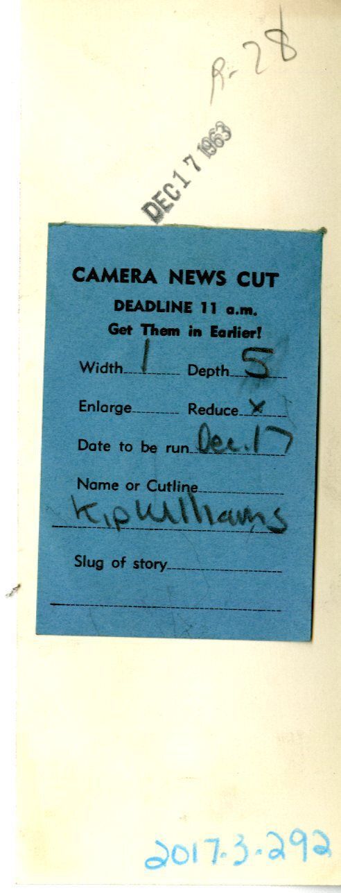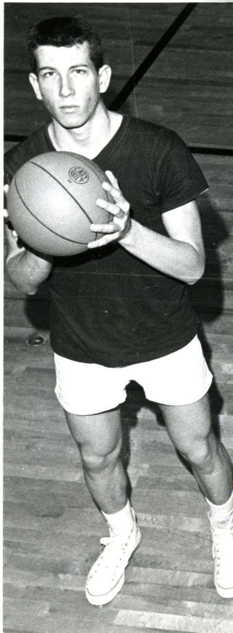Black and white photo of Kip Williams on basketball court, holding basketball.
