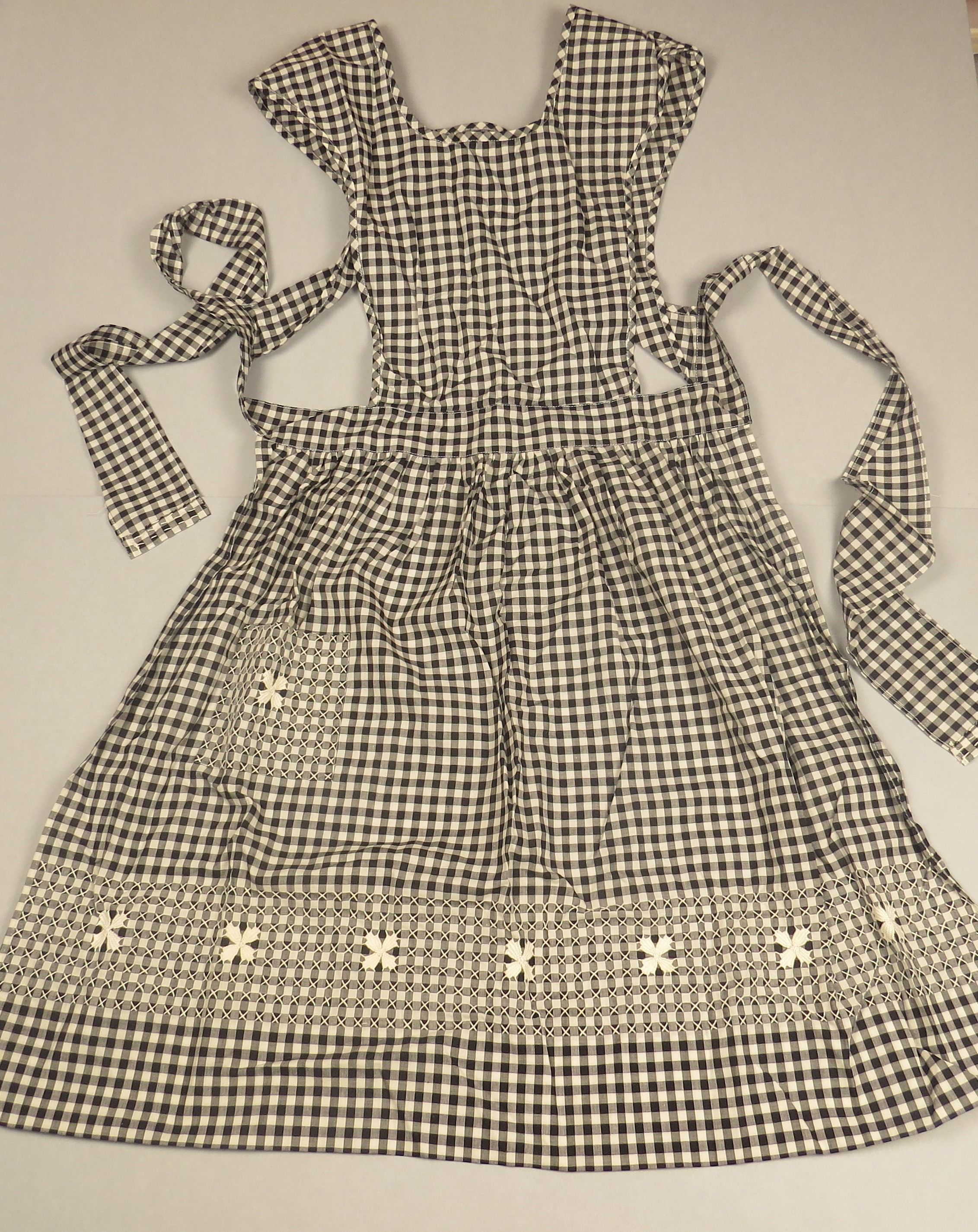 This is a black and white gingham apron in a full front style with cap sleeves. The bottom has cross-stitch and embroidery in creative patterns to create optical illusions (as was popular at this time). There are large skirt ties in back. Apron measures 17" (w) x 38" (l).Collection